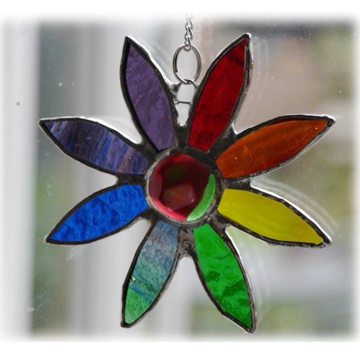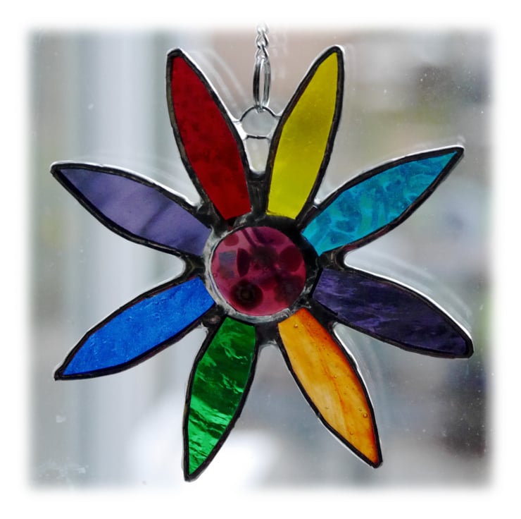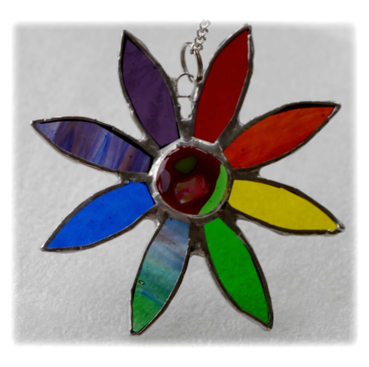 This daisy has 8 different coloured petals, lots of lovely textures in the glass, a rainbow array and is beautifully bright.