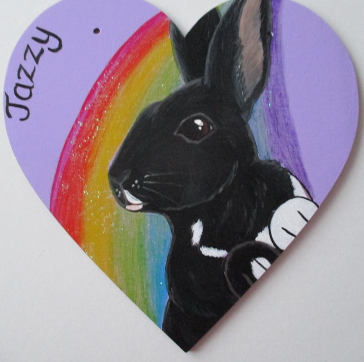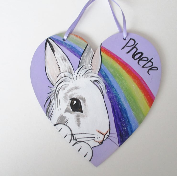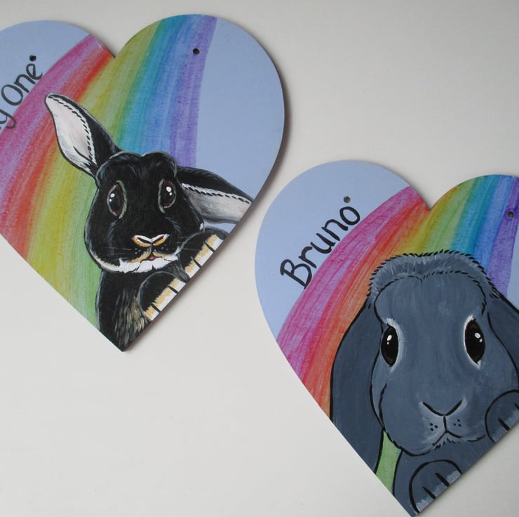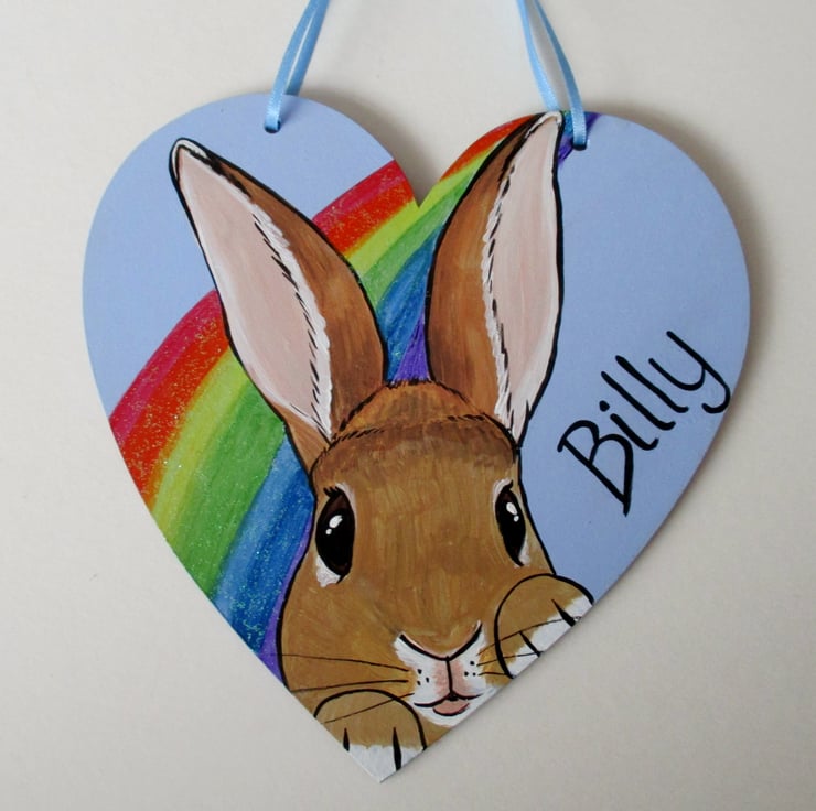 Key words: bunny bunnies rabbit rabbits heart hearts hanging door sign signs plaque plaques decoration decorations Easter gift Christmas present stocking filler custom customised customized personalised personalized name names animal pet portrait cartoon rainbow bridge memorial