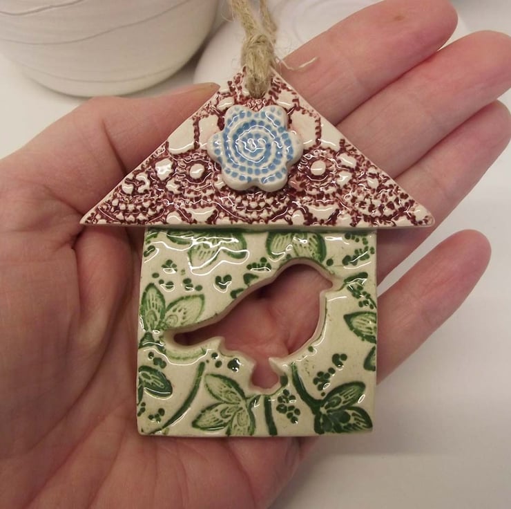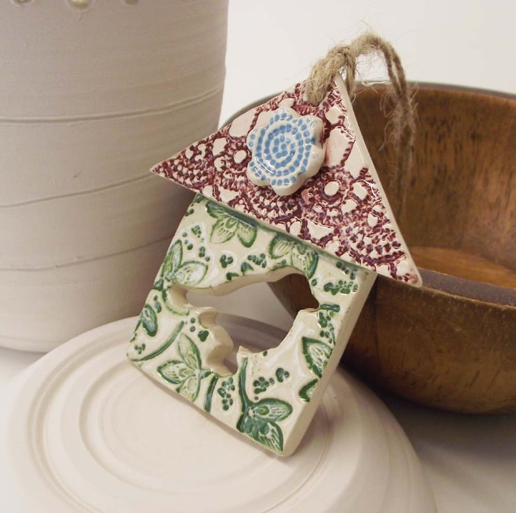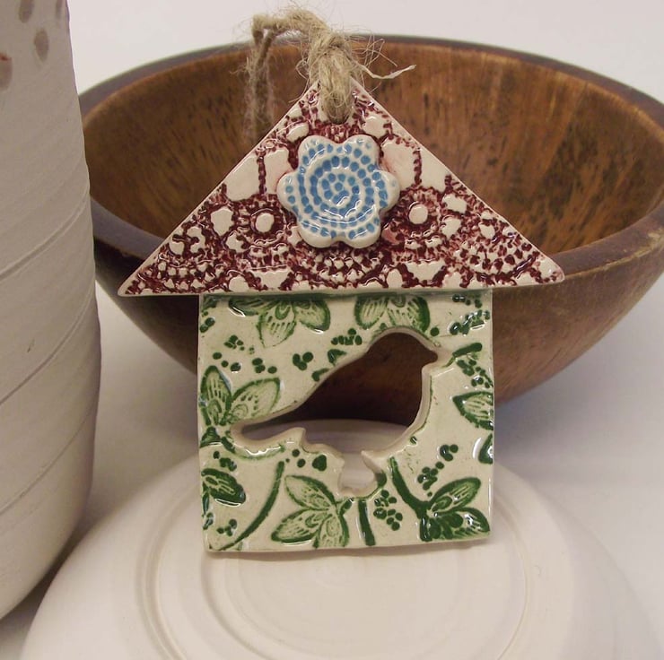 This little bird house decoration is made from white earthenware clay and finished in a leafy and floral pattern.