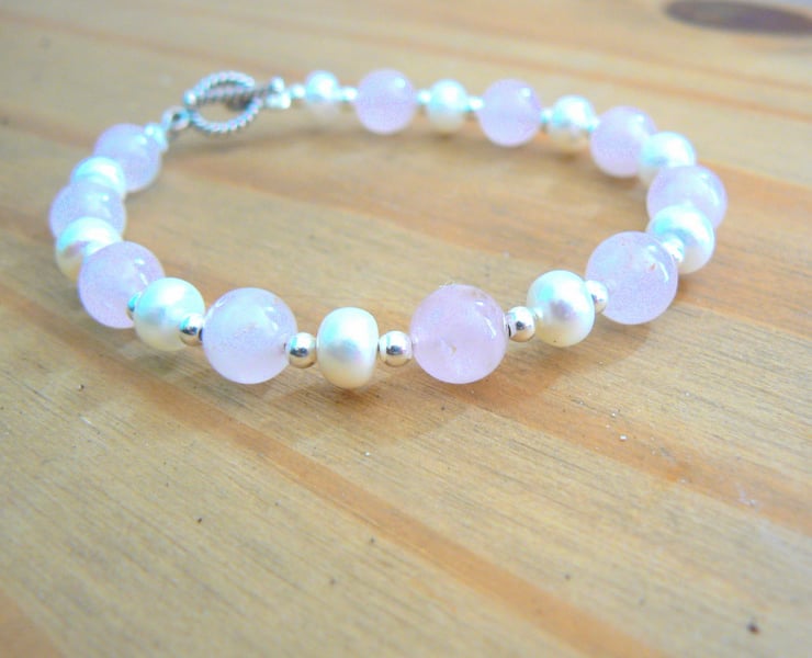 Ivory Freshwater Pearls, Rose Quartz and Sterling Silver Bracelet. One of my personal favourites. Approx 7.5 inches in length. Free gift box tied with ribbon. Grade a ivory pearls and grade a ivory pearls. A grade A pearl is blemish free and very luminous. I can make this piece shorter so please do ask!