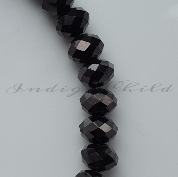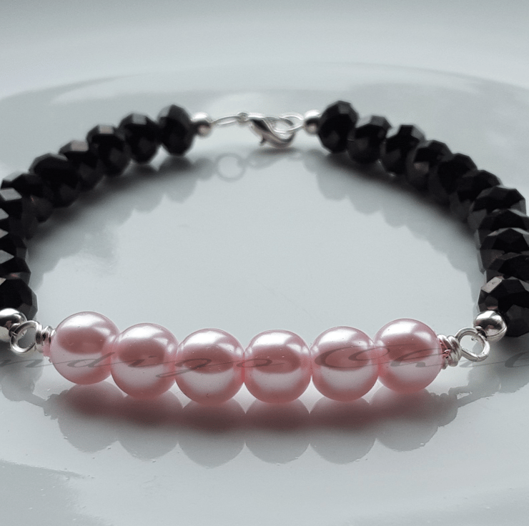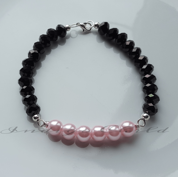 I have used six 8mm Pink glass pearl beads that have been placed onto silver plated jewellery wire. I then added twenty-two 8mm black glass faceted beads using jewellery thread. I have finished off this bracelet with two silver plated crimp beads, two 5mm silver plated jump rings and a 10mm silver plated lobster clasp.