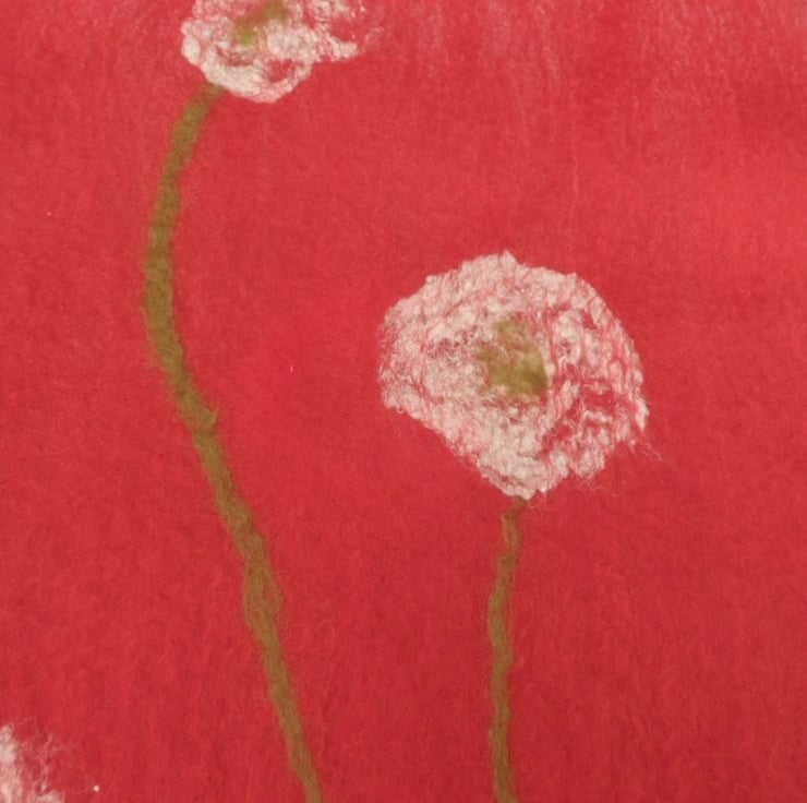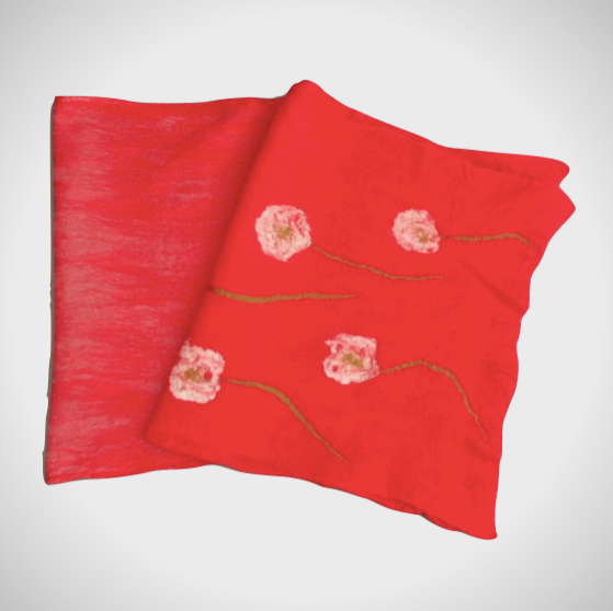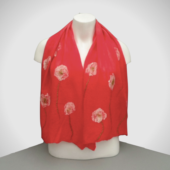 This stunning dress length scarf has been made using a nuno felting process. Very fine layers of red merino wool have been laid over both sides of a red silk chiffon base fabric and natural white silk noil has been used to add attractive, textured flowers to one side of the scarf prior to felting. The base fabric has a colour gradient along its length of red to white and back to red and this is reflected slightly in the final scarf. Although felted on both sides, the floral decoration has been added to one side only.