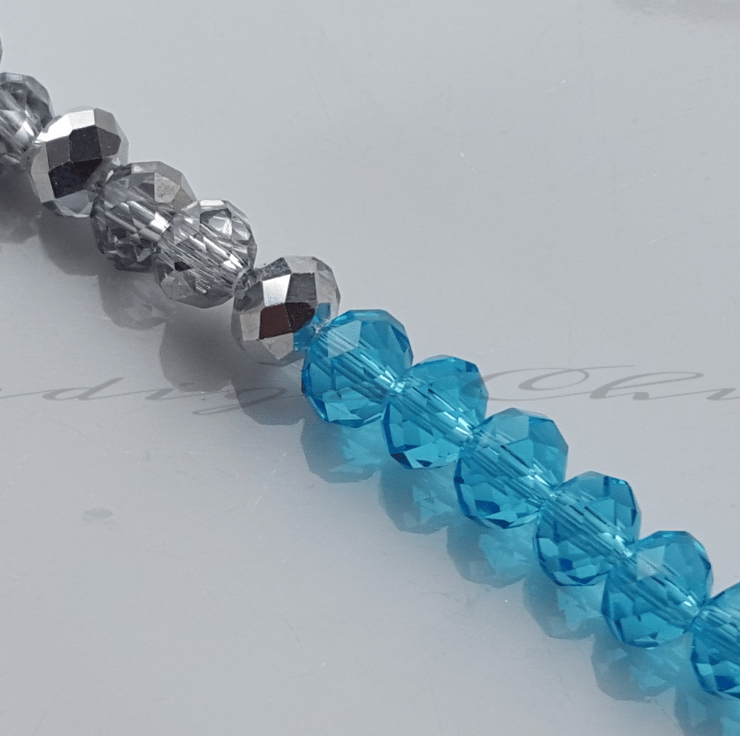 This stunning bracelet would perfect for any special occasion i.e. a wedding. I made this piece with 36 5mm blue and silver crystal gemstone beads. I have used jewellery thread to bring the bracelet together. I have finished it off with with two blue seed beads and two silver lined cystal seed beads, two 5mm silver plated jump rings and a 10mm silver plated lobster clasp.