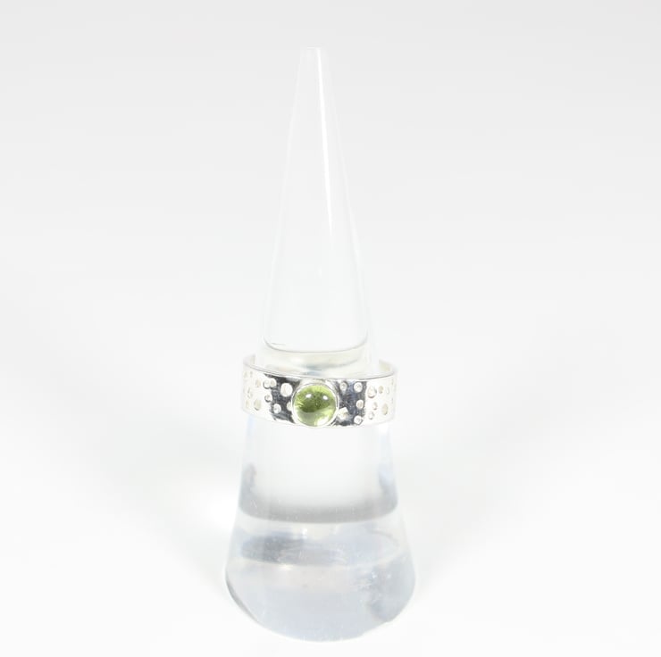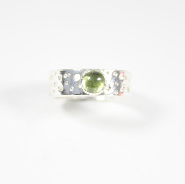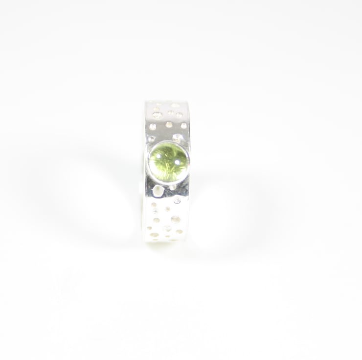 Gorgeous contemporary sterling silver ring made from 1mm silver sheet with a lacy/bubble pattern. This is achieved by drilling different depth holes with different sized drill bits in a sporadic pattern, because of this every ring is unique. The ring is finished off with a 5mm peridot gemstone, other gemstones available. The ring is 0.6cm wide.