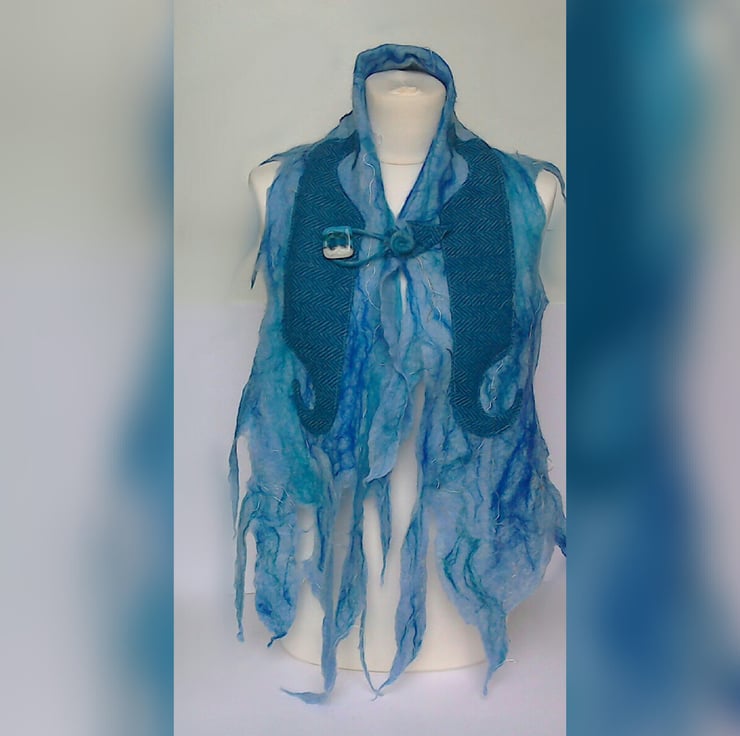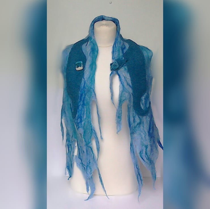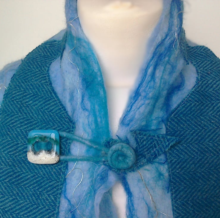I have used merino wool in a mix of blues and turquoise in making the felt and have added some silvery strands loosely on top to catch the light.