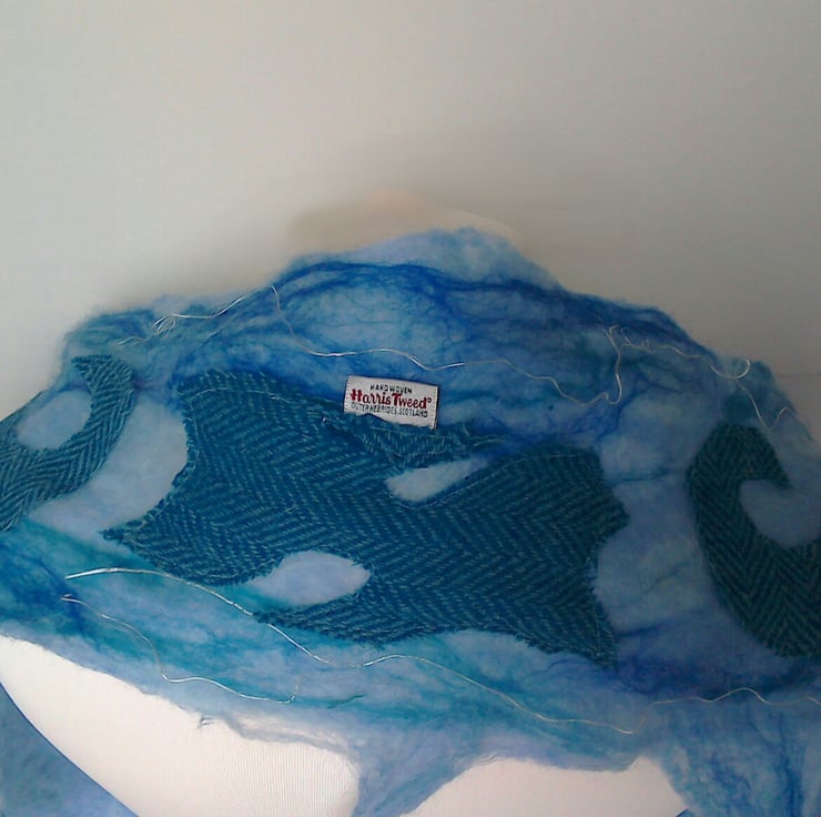 The scarf has three Harris Tweed panels in a beautiful herringbone of turquoise and teal. I have left the edges raw in keeping with the seascape design.