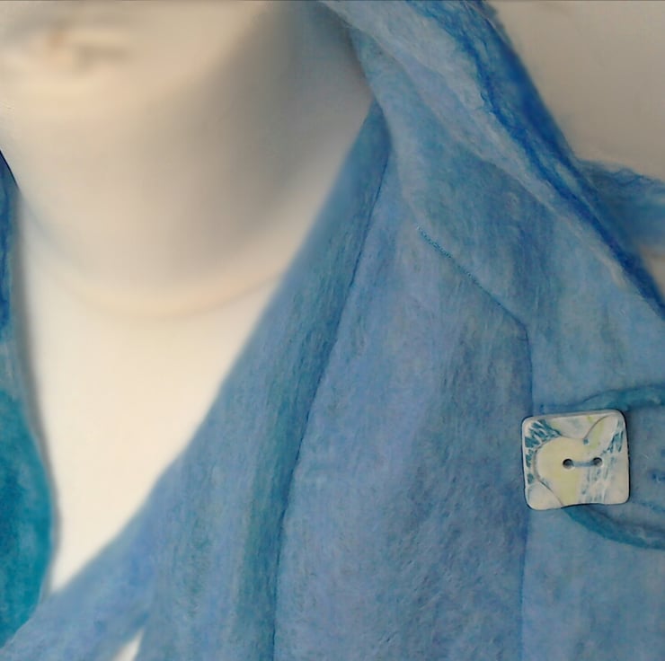 The scarf can be secured with a felt loop and a gorgeous handmade glass button (from Heavenly Anarchist) which keeps it in place, especially handy on windy days! If you prefer to wear it loose, the loop can be turned to the inside and held in place by a pretty porcelain button in complementary colours - a little secret, which you can choose to reveal or not!