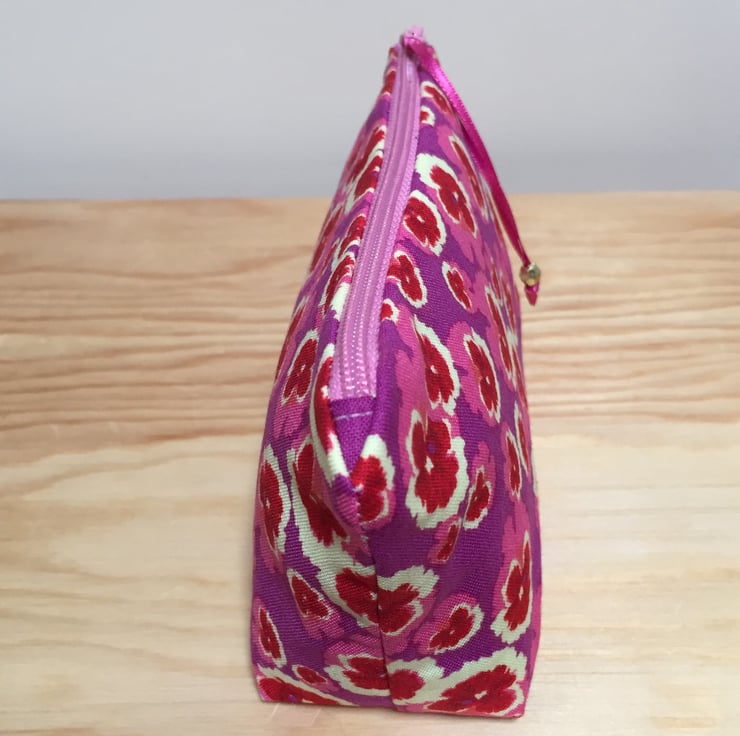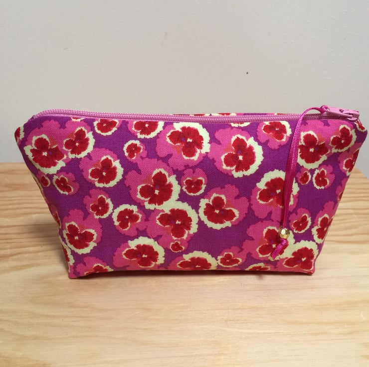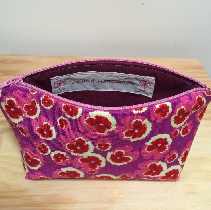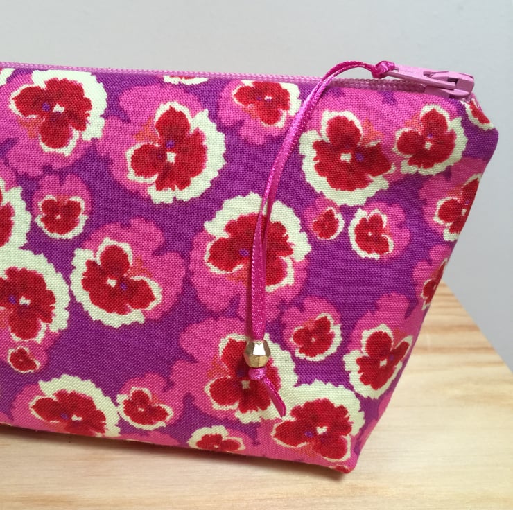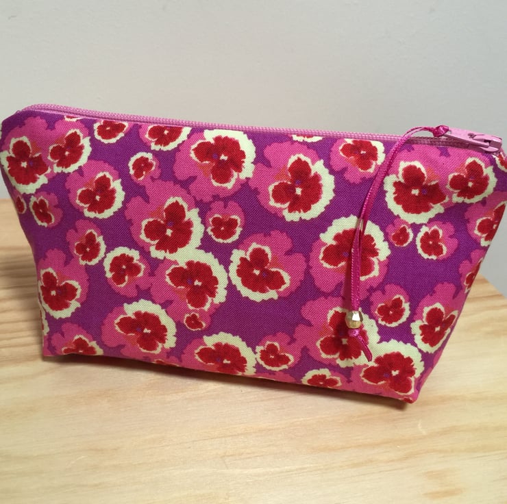 This attractive cosmetic bag is made from a bold purple/pink pansy print cotton and lined with a contrasting cotton fabric.Both the bag and lining have been interfaced to give structure and the corners have been boxed to provide stability.The bag has a matching pink zip and satin ribbon zip closure.A gold coloured bead has been added to the ribbon for decoration.A perfect accessory to keep your make up and toiletries together and tidy in your handbag.