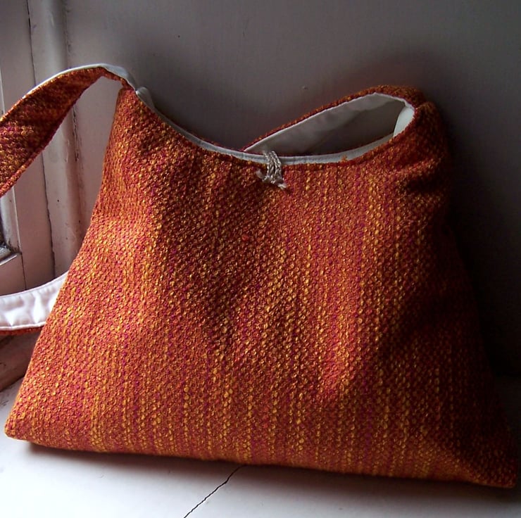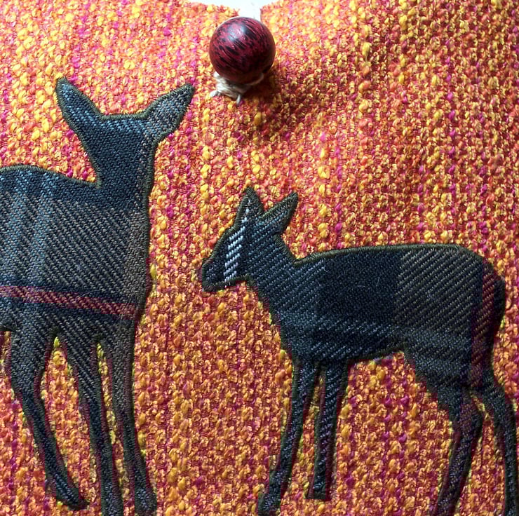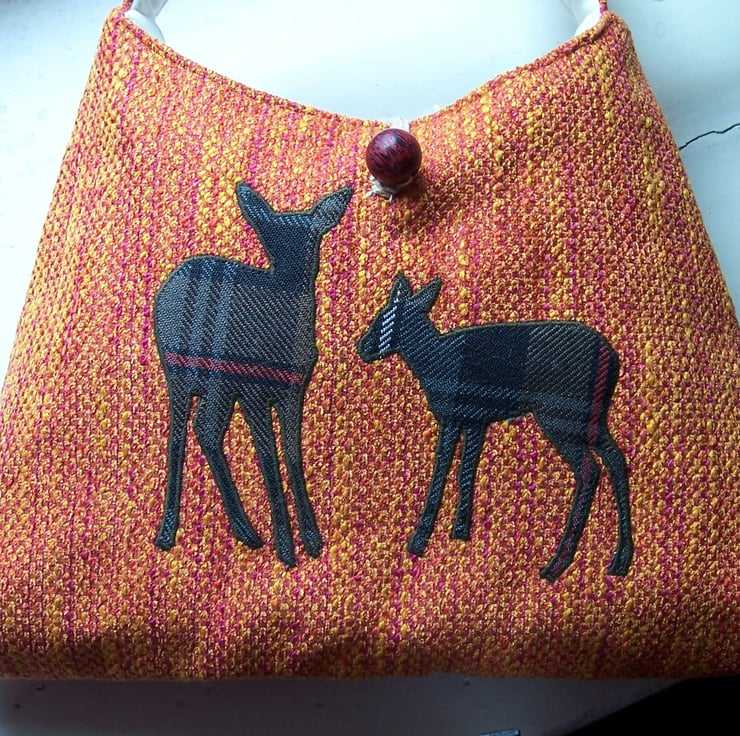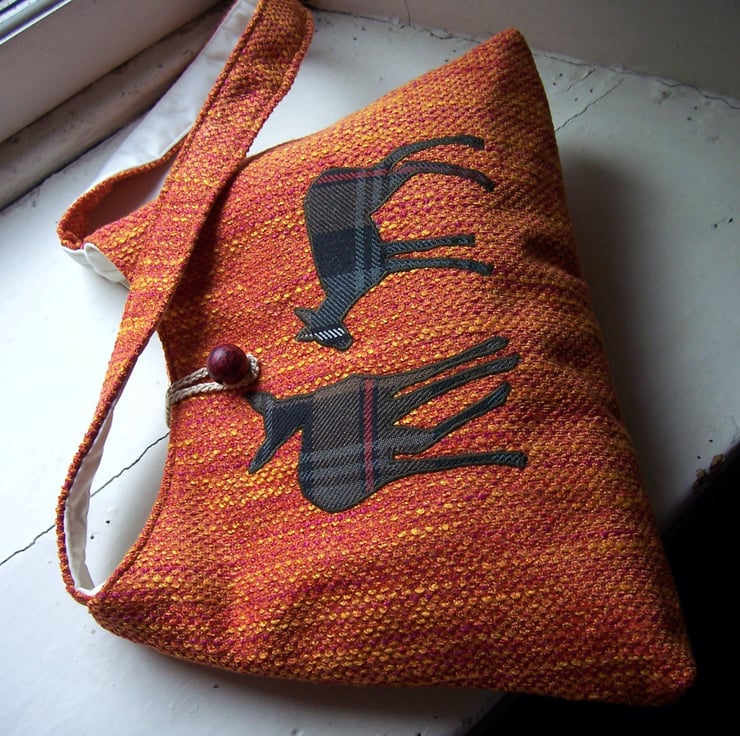 Orange tweedy textured furnishing fabric with shoulder strap. Two appliqued and machine embroidered deer in wool tartan embellish the front.