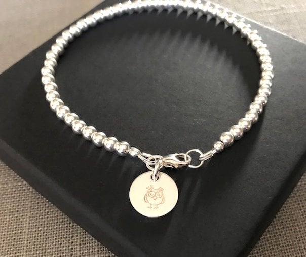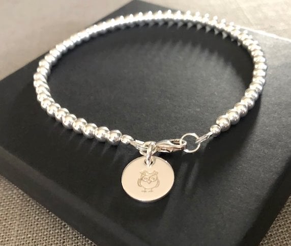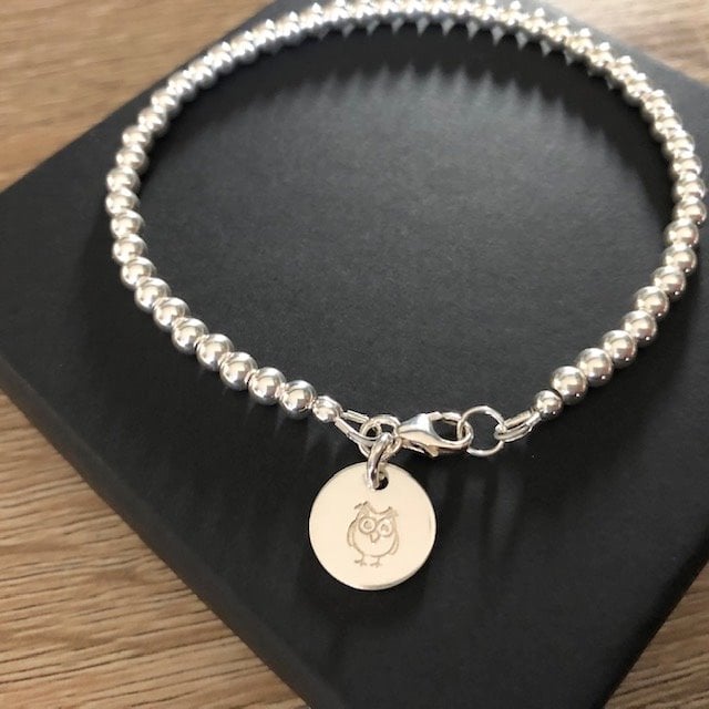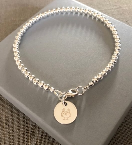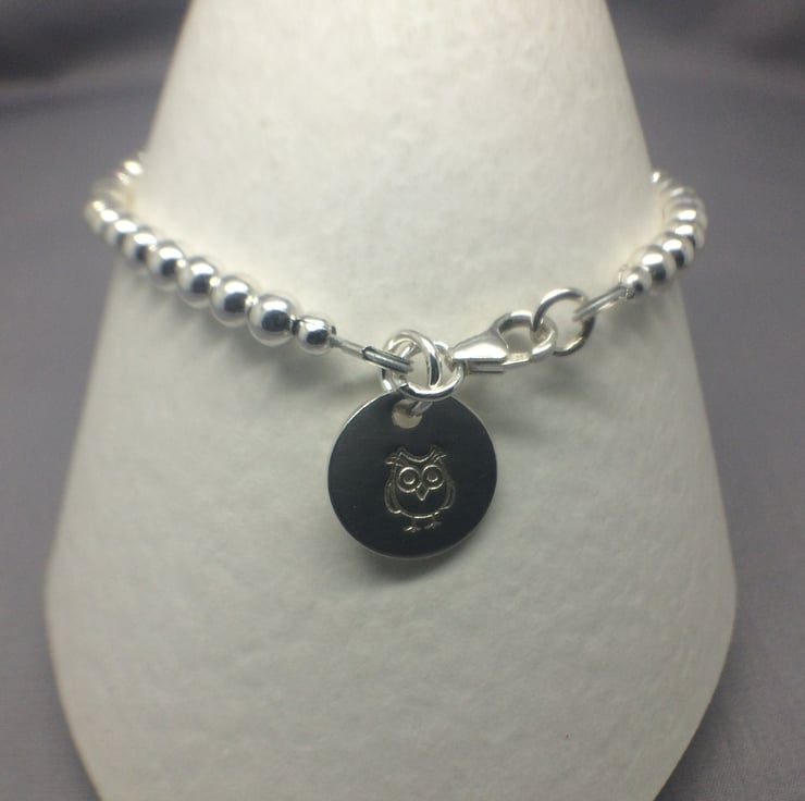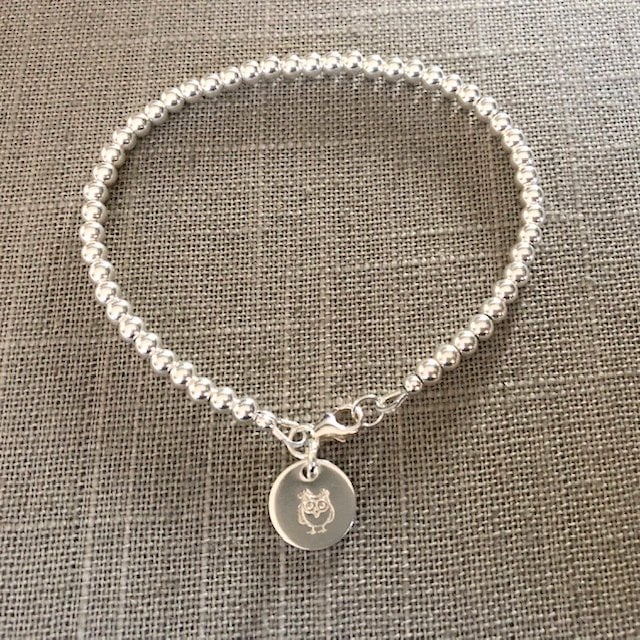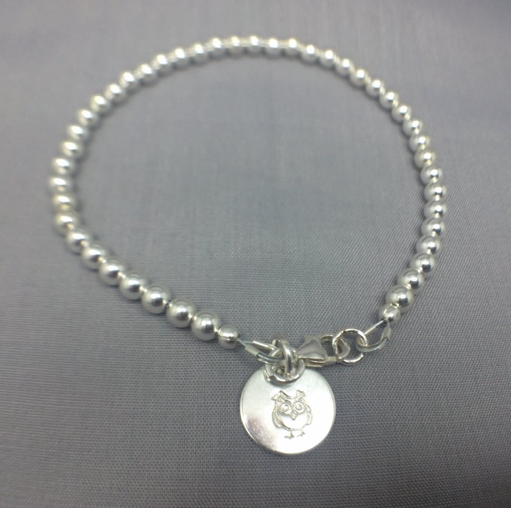 Sterling Silver Owl Charm Ball Bracelet - Handmade bracelet made with 4mm Sterling Silver beads. I hand stamped the Owl onto a Sterling Silver 12mm round disc and soldered onto the bracelet. I finished the bracelet with a Sterling Silver trigger clasp.