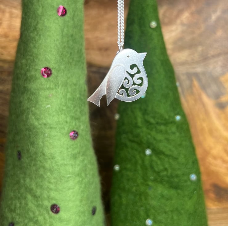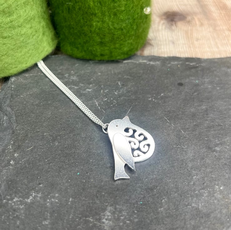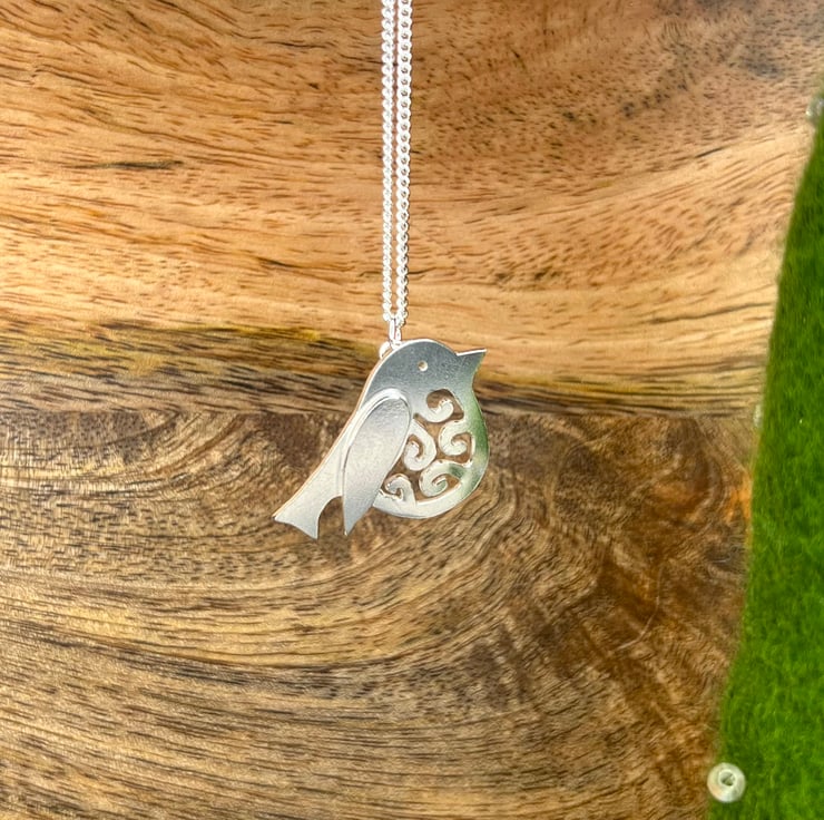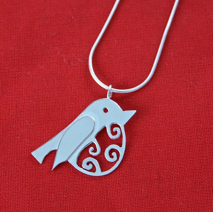 Lovely hand cut robin pendant made from 0.8 sterling silver sheet with cut out swirling filigree details for the redbreast and a 3D wing.