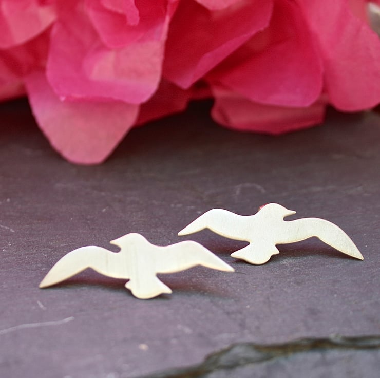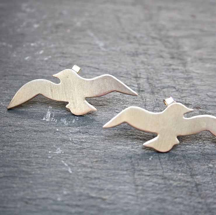 Handmade sterling silver stud earrings in the shape of seagulls in flight. Hand cut from 1mm silver sheet these earrings have a nice solid feel to them and measure approximately 4cm from wing tip to wing tip and 1.5 cm high.