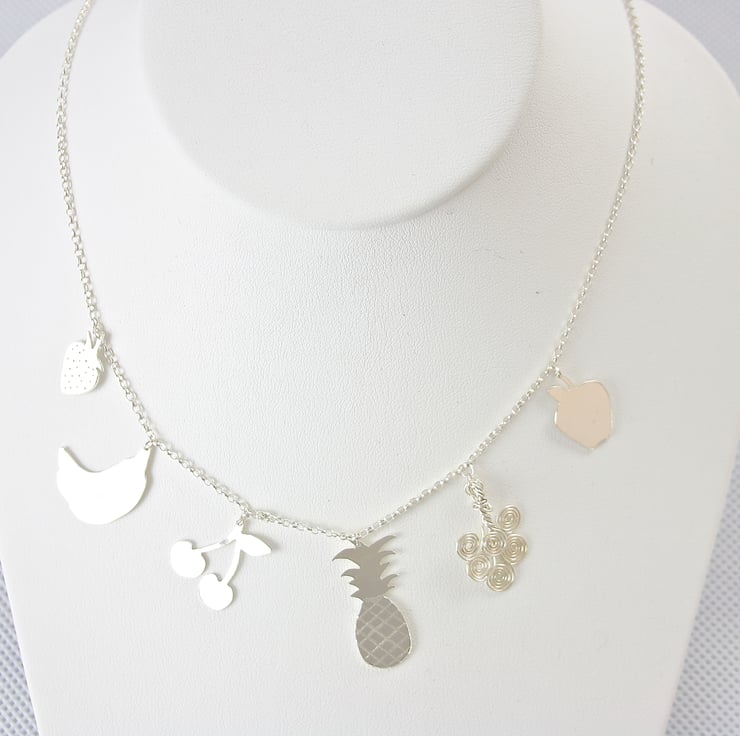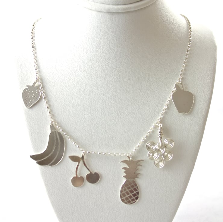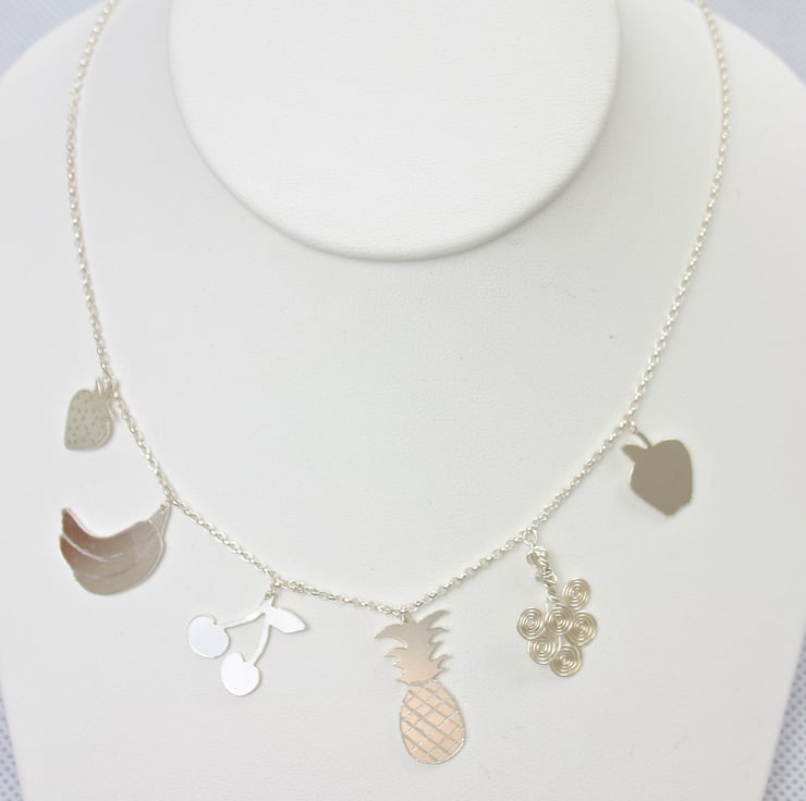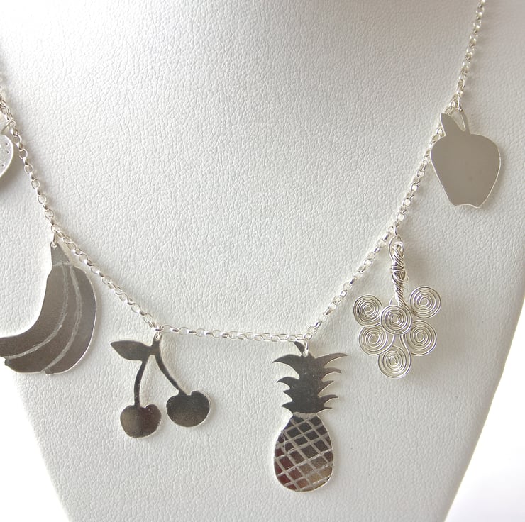 Dainty sterling silver necklace with different fruit charms. 6 different fruit charms hang from a silver belcher chain they are; a strawberry, a bunch of bananas, a pair of cherries, a pineapple, a bunch of grapes and an apple. All of the fruits are hand cut from silver sheet except the grapes which are made from spiralled silver wire. The fruits have engraved and drilled details.