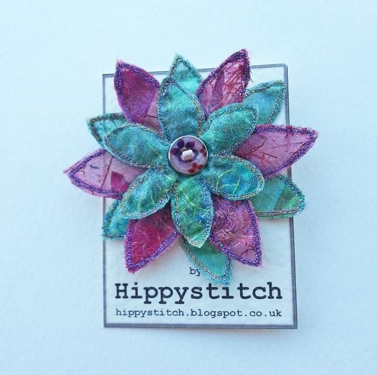 This delicate sparkly flower brooch has been stitched from a handmade fabric constructed from a collage of sheer and sparkly fabrics and threads. It has been machine stitched and has a button and bead in the centre.