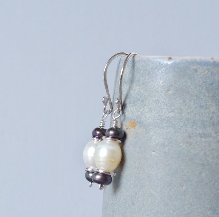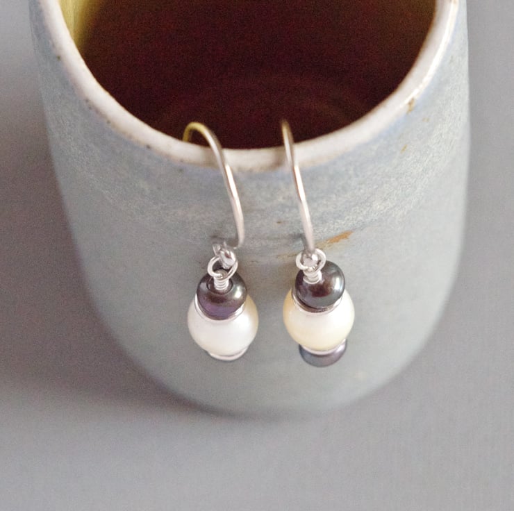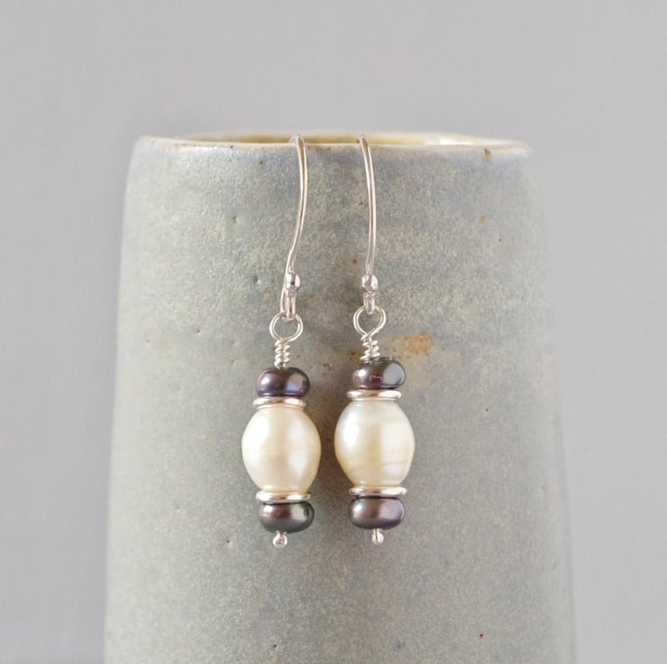 Inspired by the colours of evening wear these classically styled pearl earrings look beautiful at any time of day. The sterling silver ear wires and spacers have all been created by me at home in Sussex to combine with these beautiful creamy white and dark grey peacock freshwater pearl, so called because of the rainbow lustre they have in abundance. Pearl is the June birthstone and these would make a lovely birthday present. They measure 35 mm or 1 1/2" in length. The final photograph shows them next to a vintage lipstick case measuring 3" in length in order to give you a sense of scale.