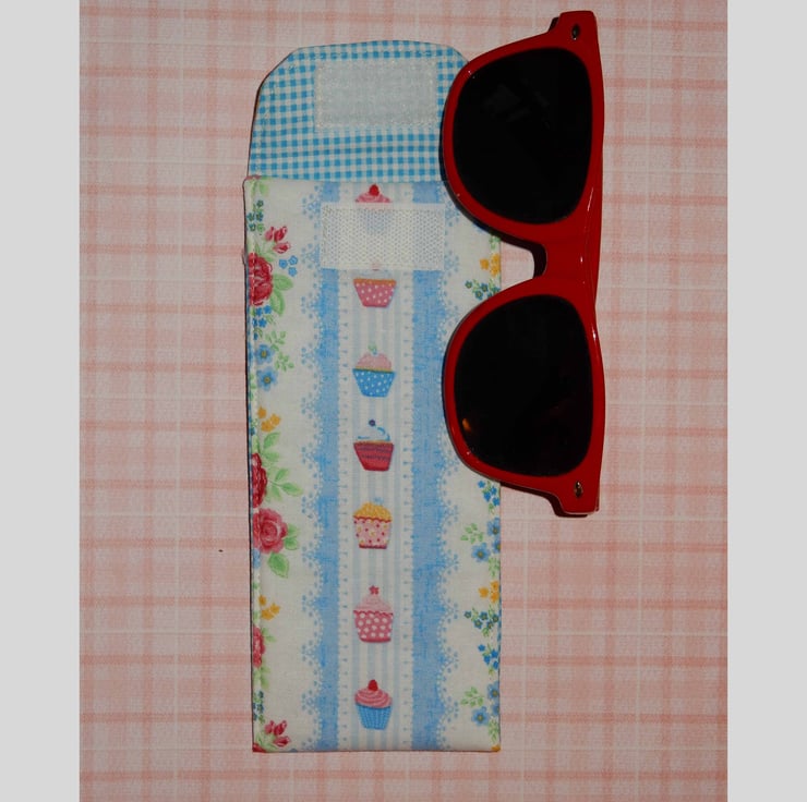 A handy case for your glasses or sunglasses.This is made from a cotton print fabric featuring flowers and cupcakes, with a toning checked lining. It also has a layer of wadding for protection. The case fastens with velcro.