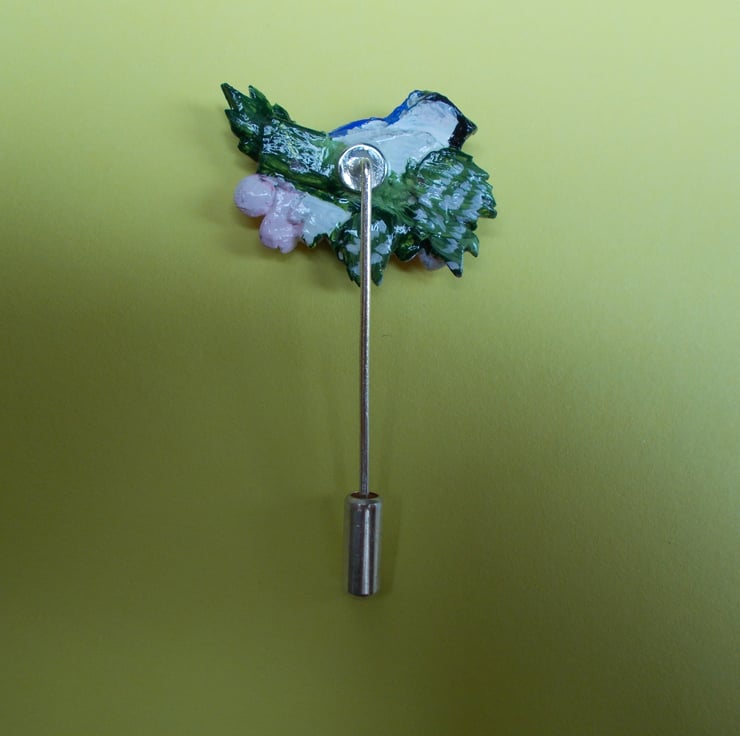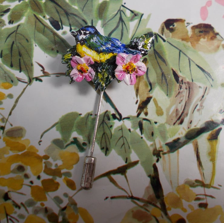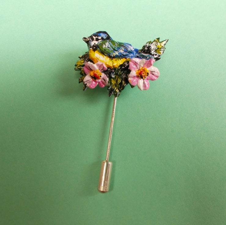 The BLUE TIT & PINK Flowers STICK PIN..... Lapel Flower / Wildlife Pin.