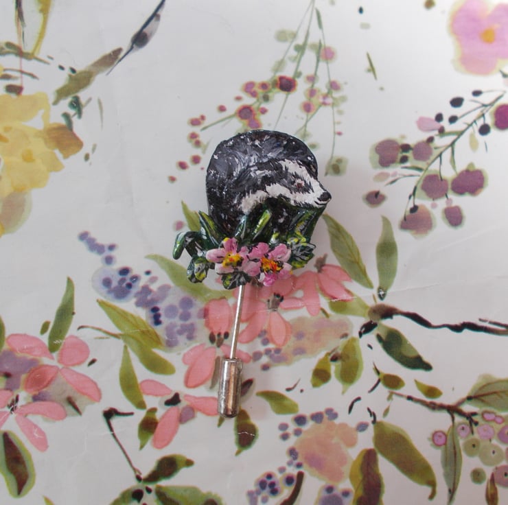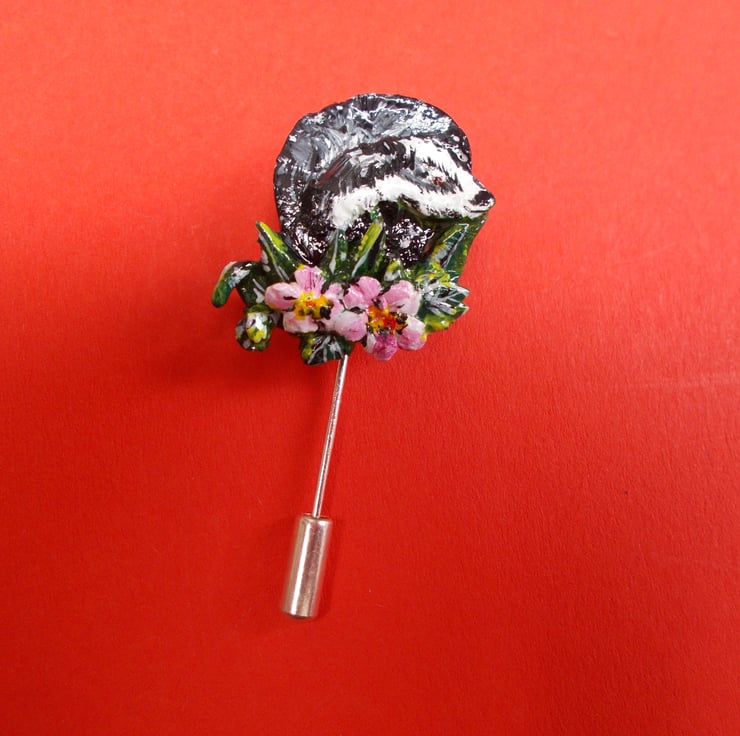 The BADGER & PINK FLOWERS PIN- Lapel Flower / Wildlife Pin.