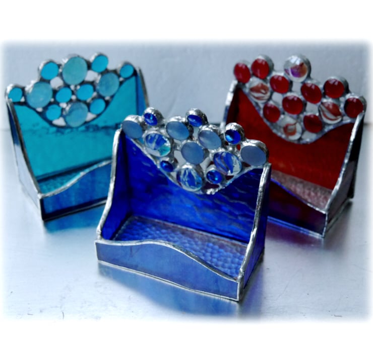 This is a business card holder handmade in stained glass using the Tiffany copper foil technique.