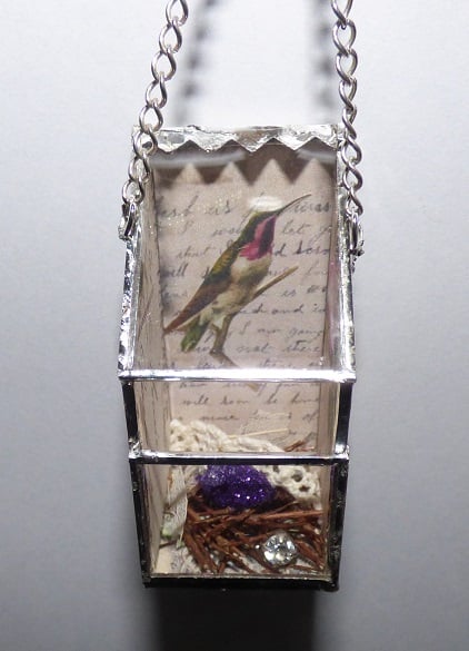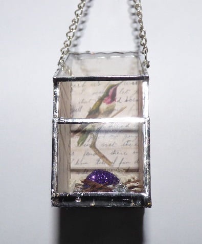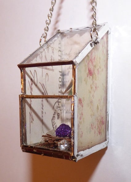 I have hand cut glass pieces to create this miniature bird box. It measures 2x1x1 inches. The glass sections have been soldered using lead free solder.