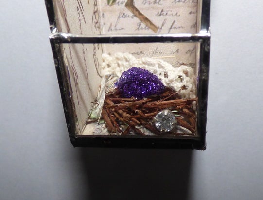 I have decorated some panels of the box with shabby chic paper with hand written text on it. The nest is made up of twigs and embellishments like diamantes, skeleton leaves, lace and even a glittered purple egg.