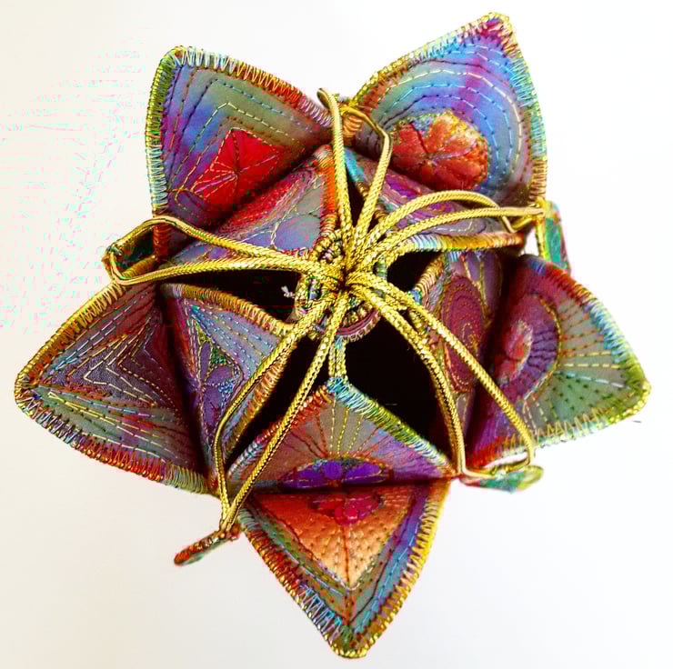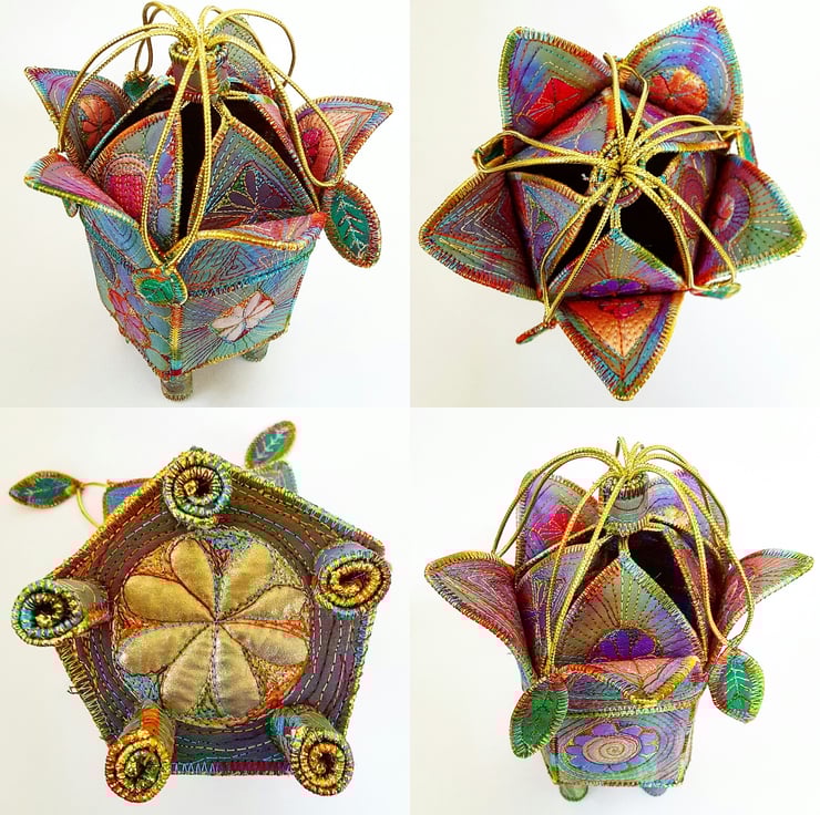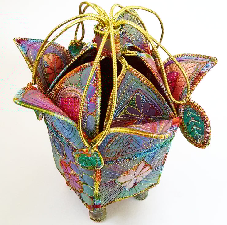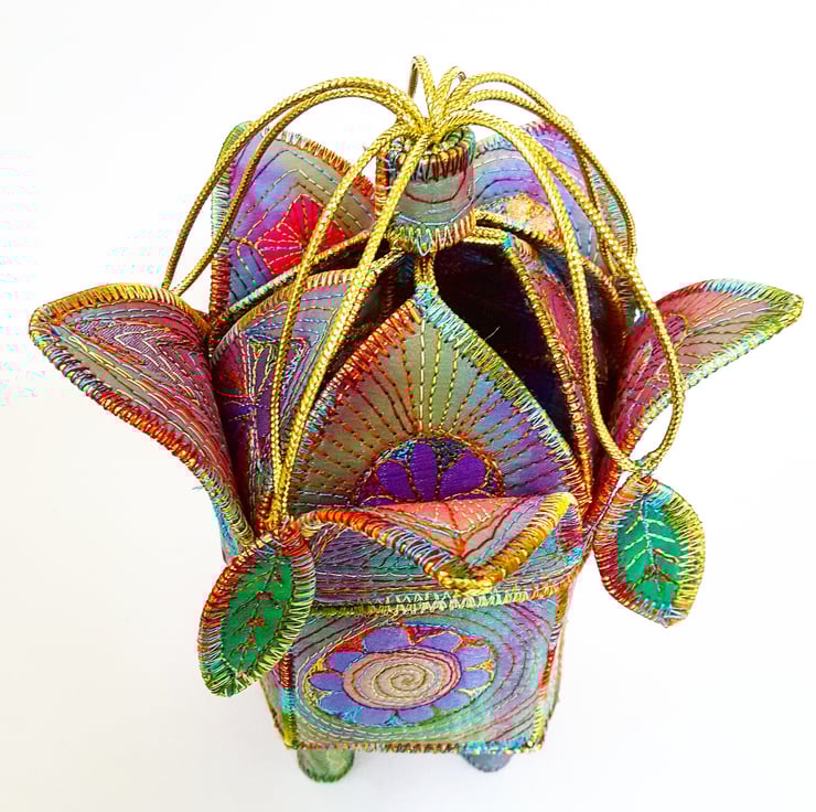 This is a handmade machine stitched textile flower pod, made with hand dyed Egyptian cotton and silk fabrics. Made from layers of fabric and plenty of free machine embroidery and this makes this quite a stiff textile vessel.