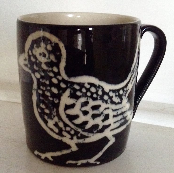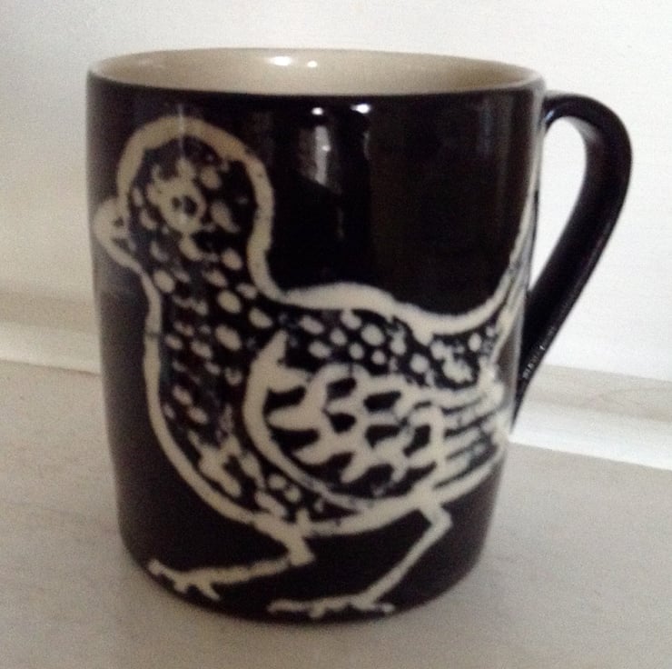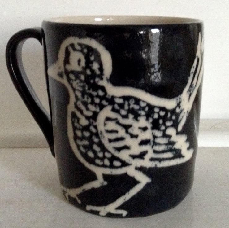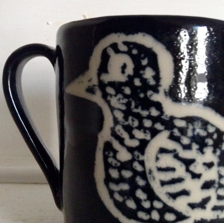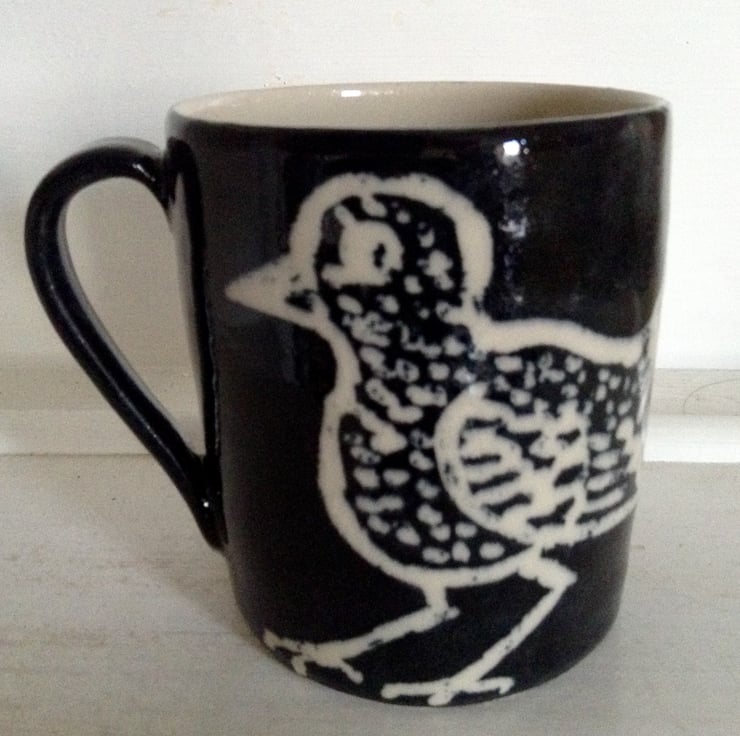 Black hand thrown stoneware mug with cute bird design in cream. It measures 10 cms high and is 8.5 cms across. It holds 3/4 of a pint and I s made from tough stoneware clay and is dishwasher and microwave safe. It is a great size for the serious tea or coffee drinker.