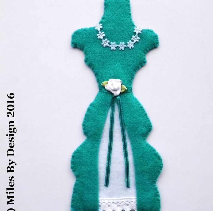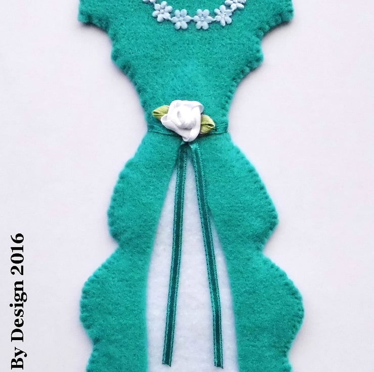 The dress has been handcut from a template that I have designed myself. It was made from a turquoise felt with a white felt front panel. The neckline is enhanced with pretty pale blue ribbon flowers. At the waist is a thin turquoise ribbon, tied with a white ribbon rose embellishment, At the base of the front panel is a cotton lace ribbon.