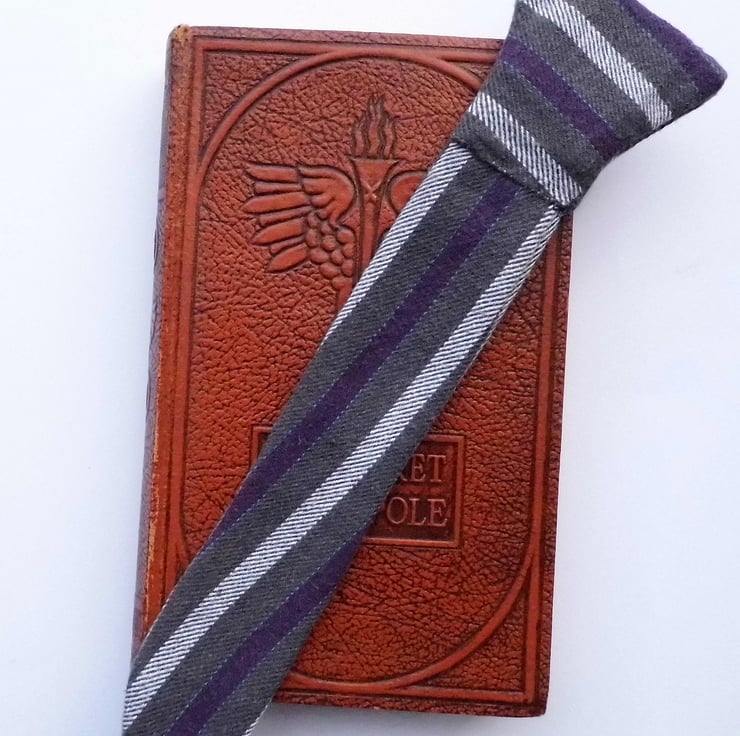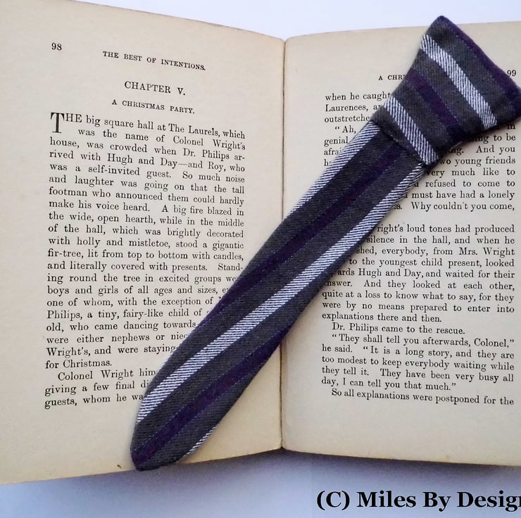 The bookmark is made from a striped flannel cotton with a flexible plastic inside to give it some rigidity but it is still bendable. The base colour is dark grey, with a white & purple pinstripe.