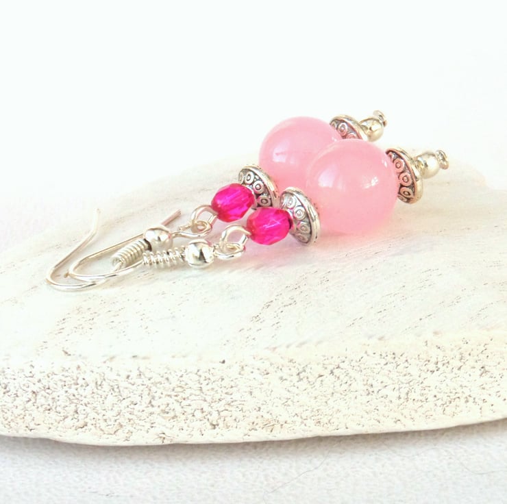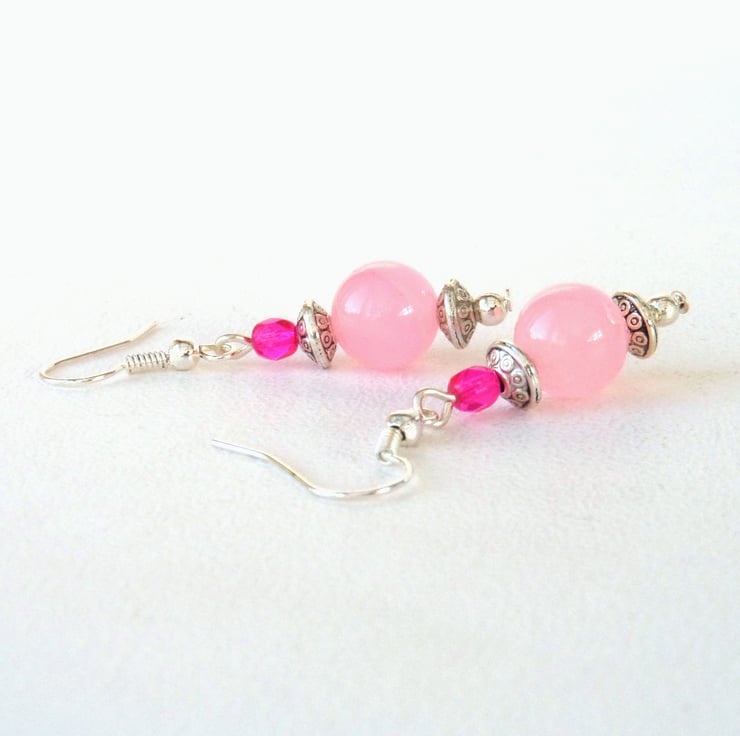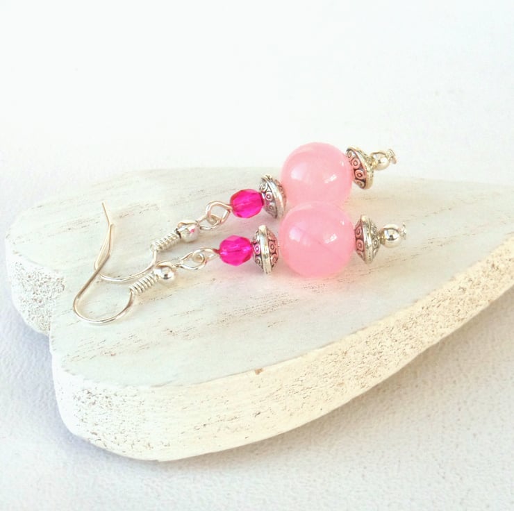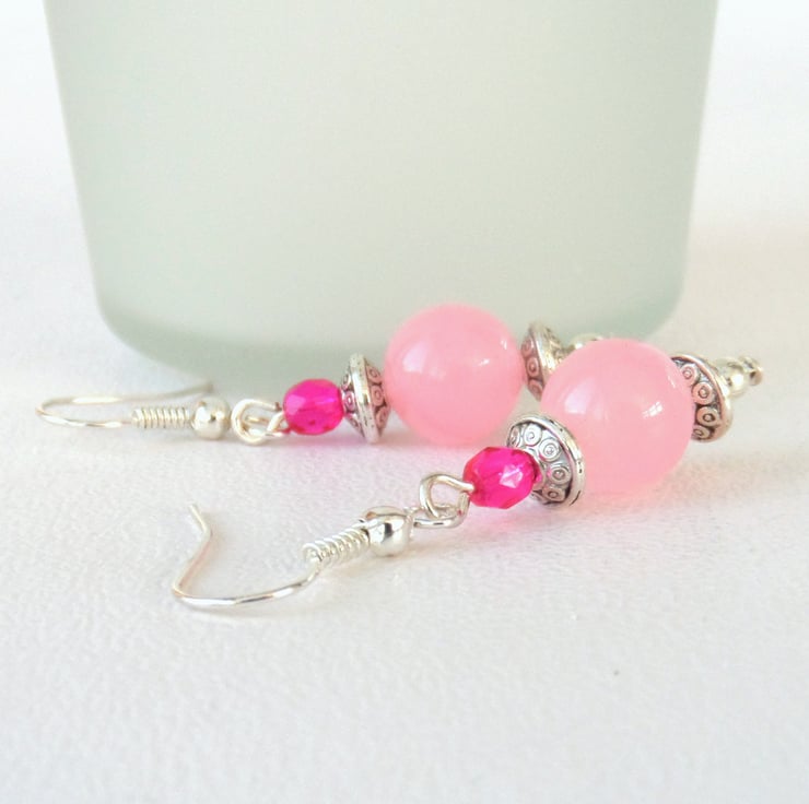 Lovely pink earrings, made with pale pink jade and vivid pink crystals.