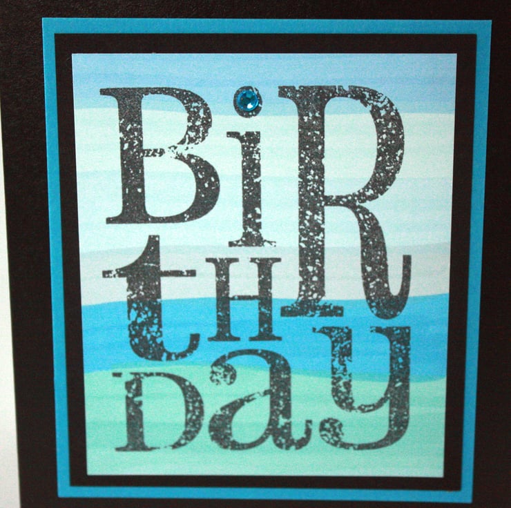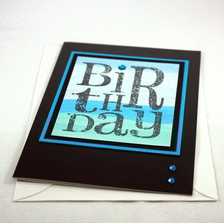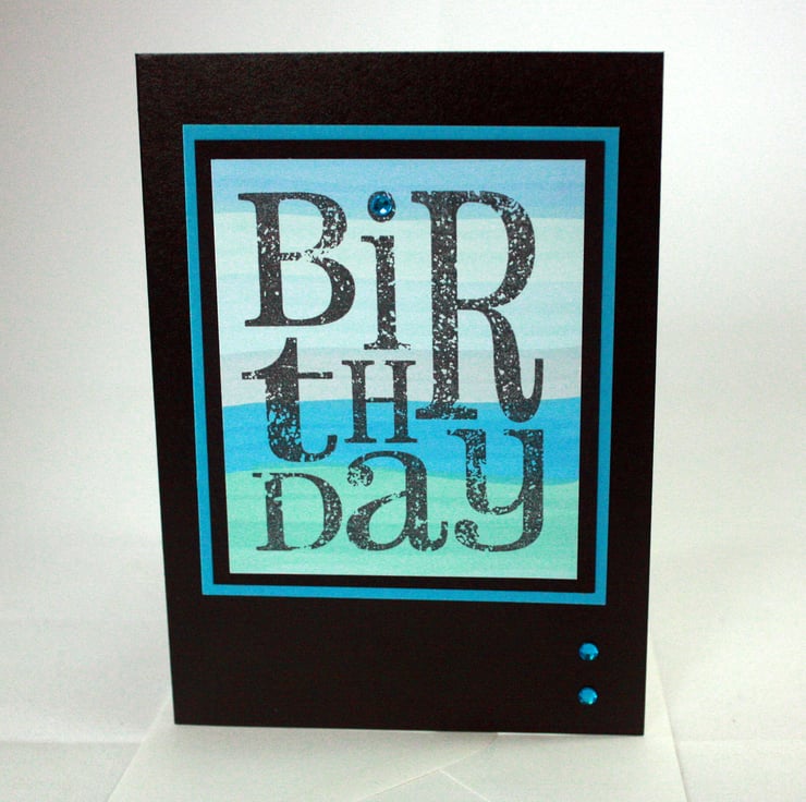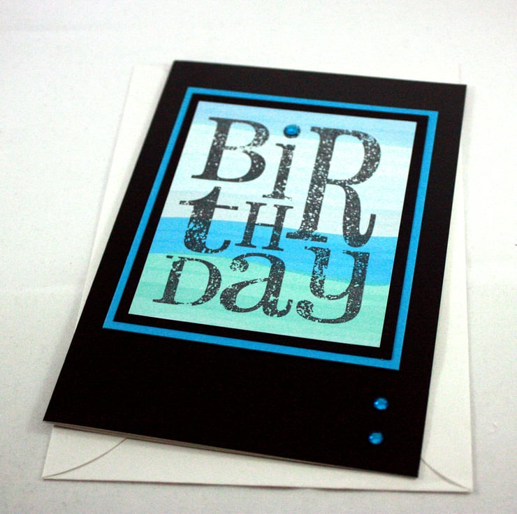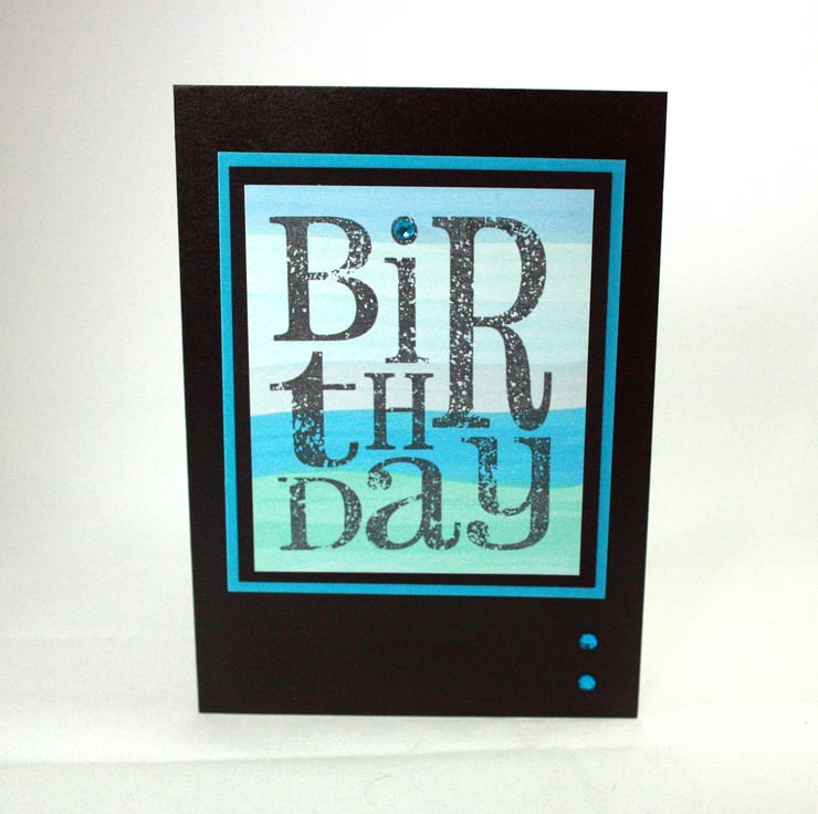 A6 sized birthday card featuring the word 'Birthday' stamped in black ink, onto a striped background created using Promarkers. This has been framed by bright blue card and finished with 3 blue rhinestones on a black pearlescent card blank .