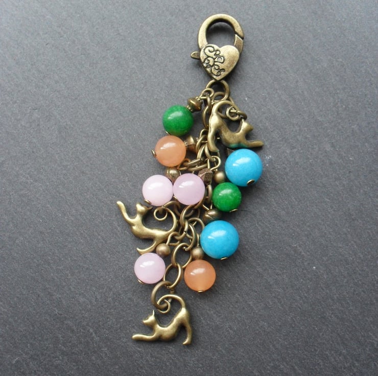 Multi coloured bag charm with blue, pink, green and orange semi precious gemstones are attached to a bronze tone chain and clasp. With some small bronze tone beads