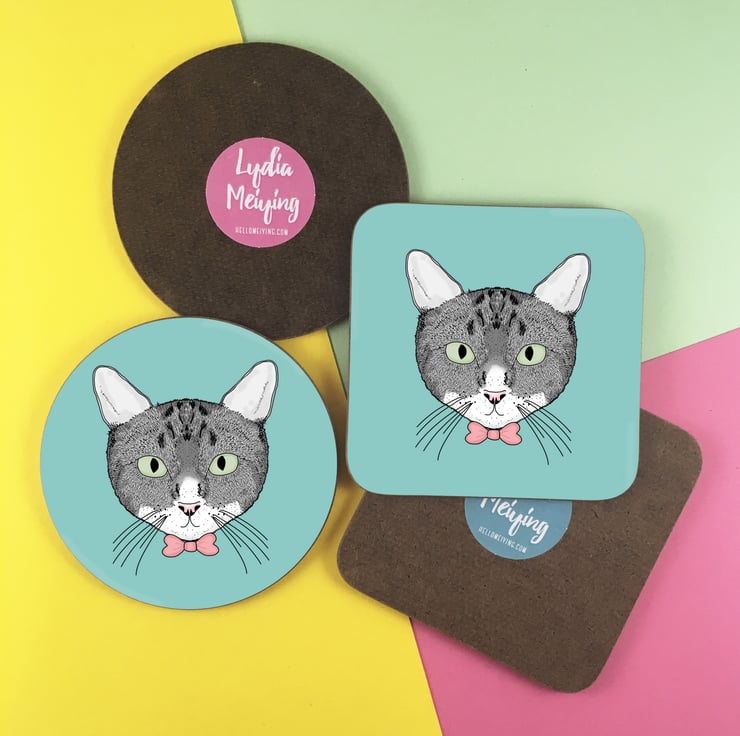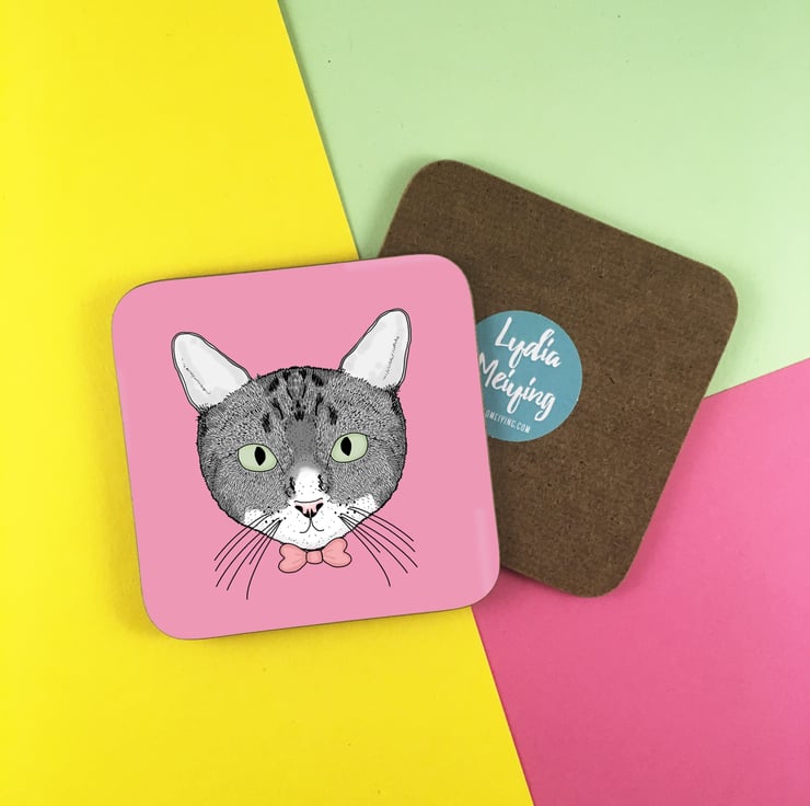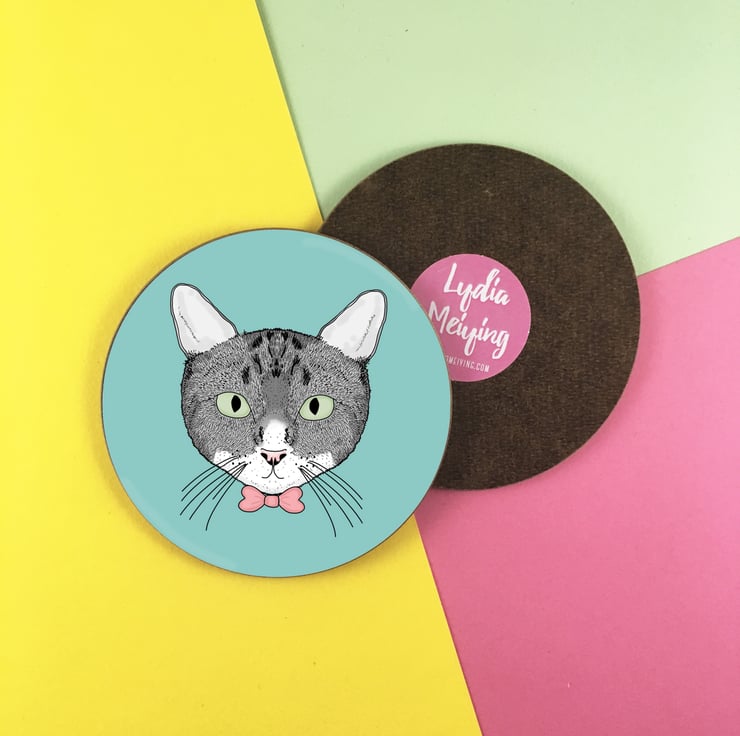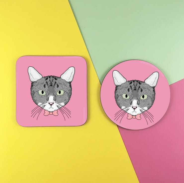 A cute coaster to protect your surfaces from hot and cold drinks. This coaster features a cute illustration of a grey cat and is available on a choice of a pink or turquoise background.