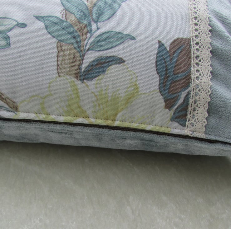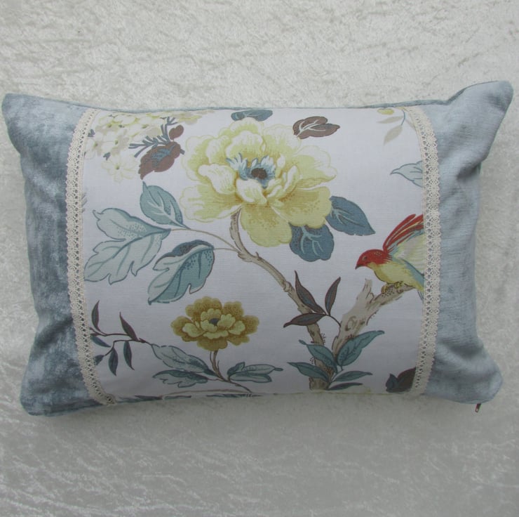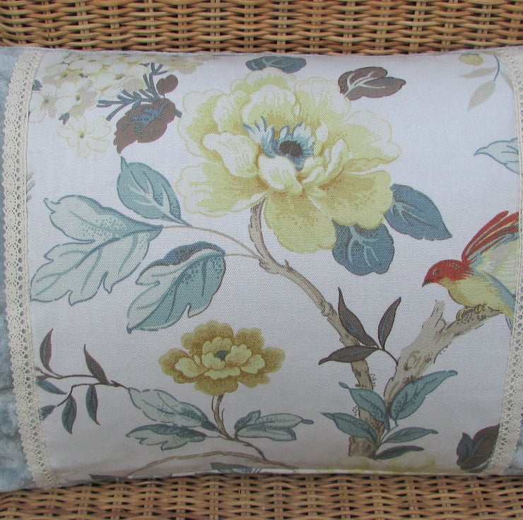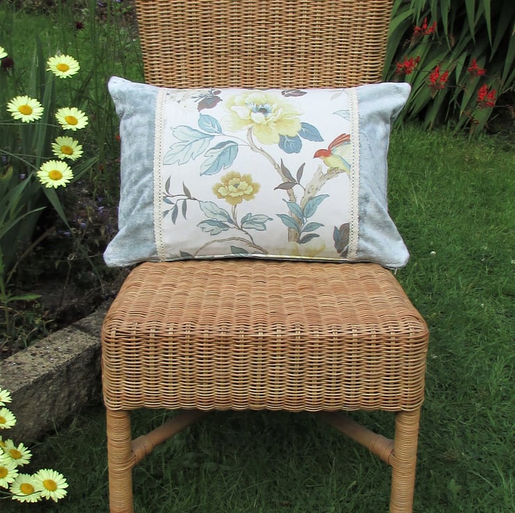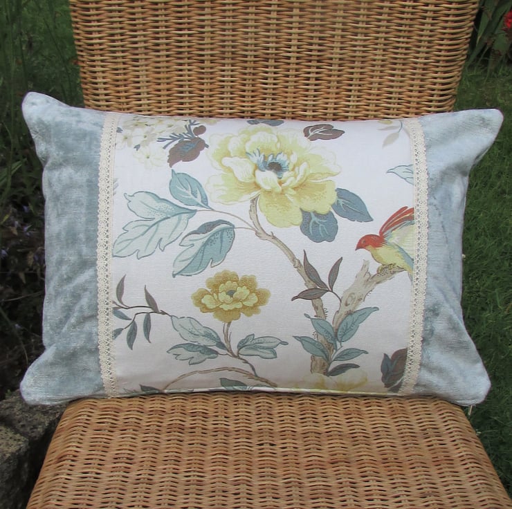 A shabby chic rectangular cushion in a luxurious duck-egg blue velvet-finish fabric with a central panel featuring a floral print. The panel consist of a beautiful vintage style fabric with a large floral print in shades of duck-egg blue, cream and golden yellow. The print also features a bird with a hint of red colouring. The edges of the panel are finished with a pretty cream lacy trim.