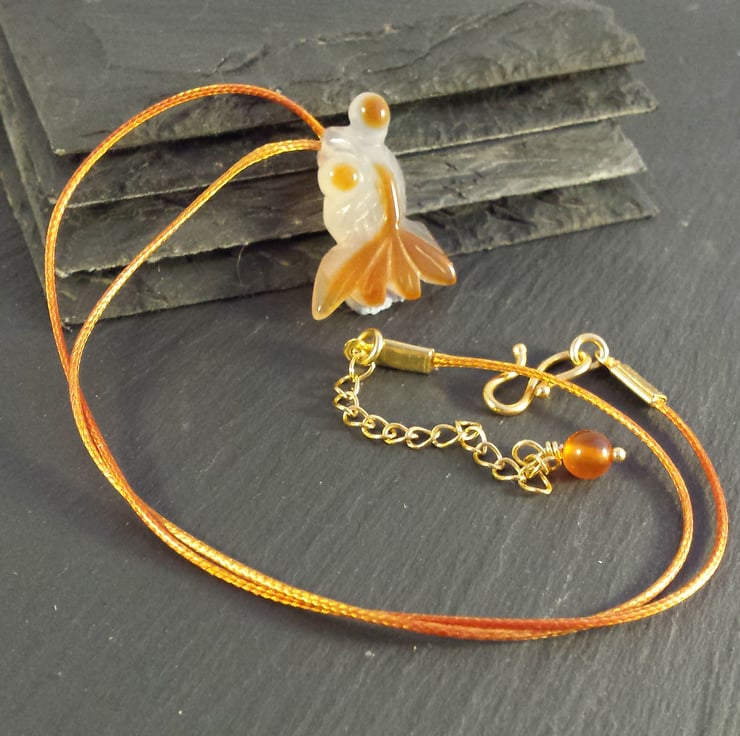 This cute little kio carp is carved from orange agate and threaded onto slightly varigated burnt orange waxed cotton cord, finished with a gold plated s-clasp and extender cahin with an orange agate bead. The carp is 2.8cm/1.2in, the cord is 46cm/18in with a 5cm/2in extender, I've made it slightly longer as I feel he is unisex.