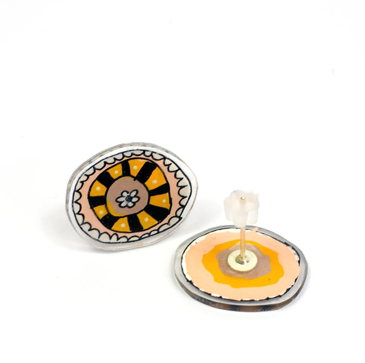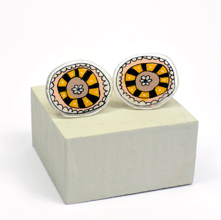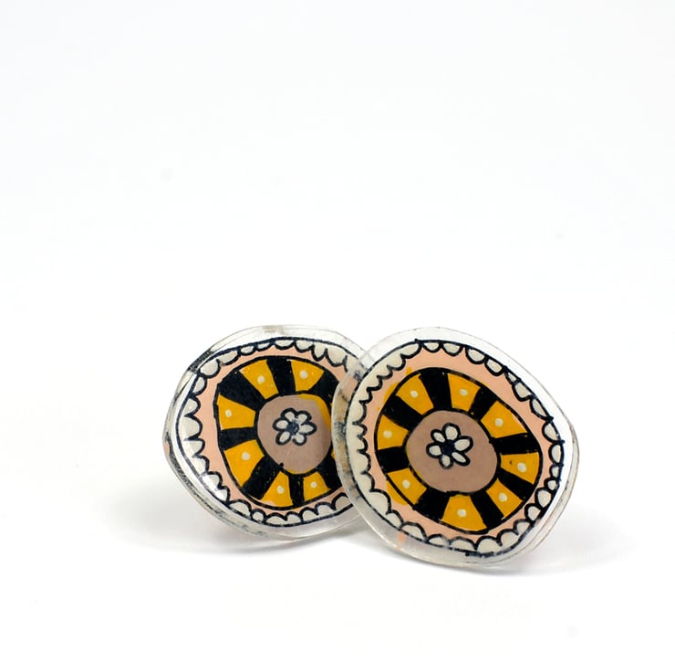 These are a pair of lovely doily inspired ear studs that look like pretty little doily flowers. The colours are pink, purple, mustard, black and white.
