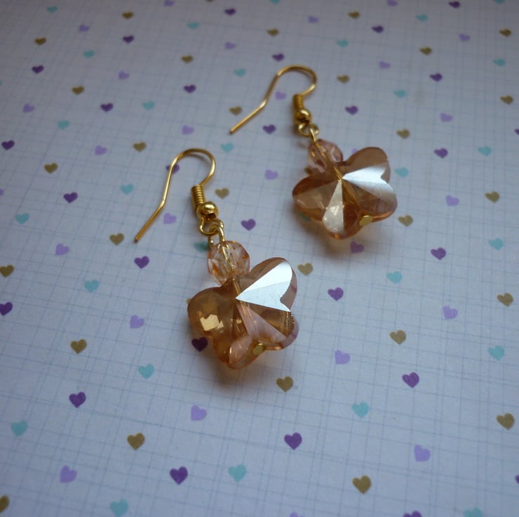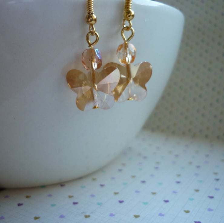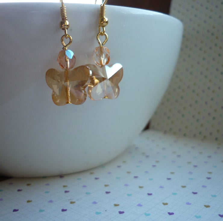 THE EARRINGS HAVE BEEN MADE USING SINGLE FACETED CRYSTAL BUTTERFLY GLASS BEADS IN GOLD ALONG WITH SMALL FACETED GLASS ROUND BEADS IN GOLD AND FINISHED WITH NICKEL FREE FISH HOOK EAR WIRES.
