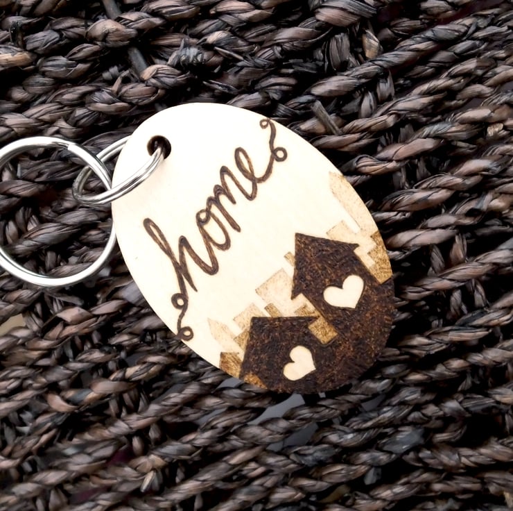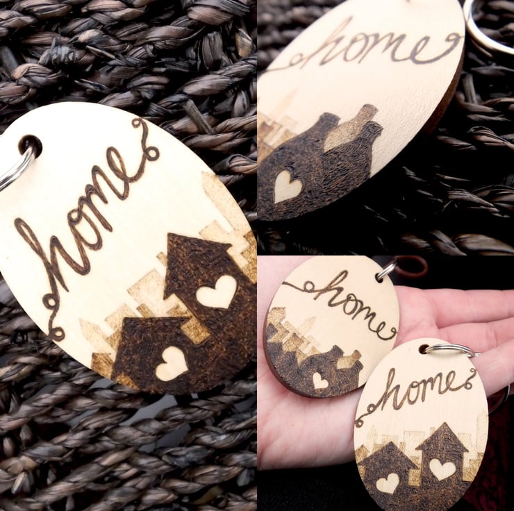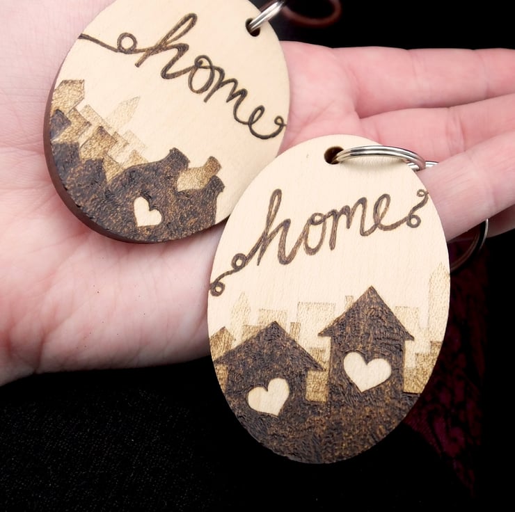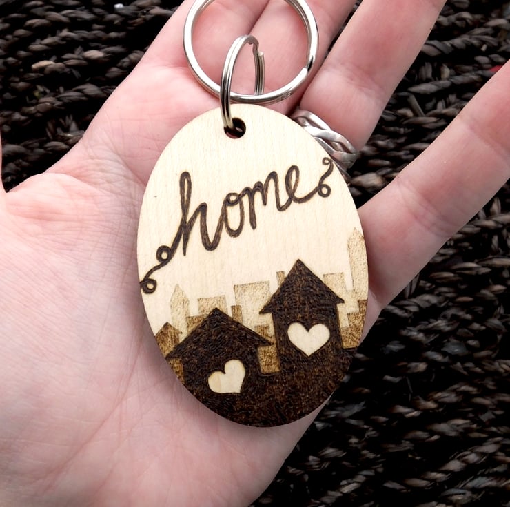 Here is a chunky wood oval keyring, with two houses in silhouette and a fading cityscape. This is my own design, burned freehand into the surface using Pyrography. It is completely unique and there won't be another exactly the same. The images show some other designs.