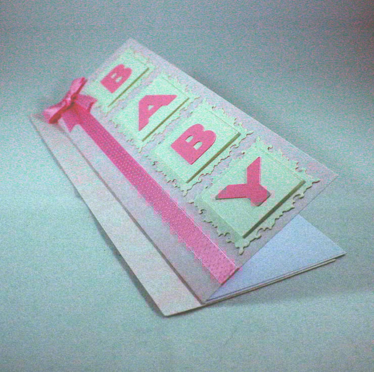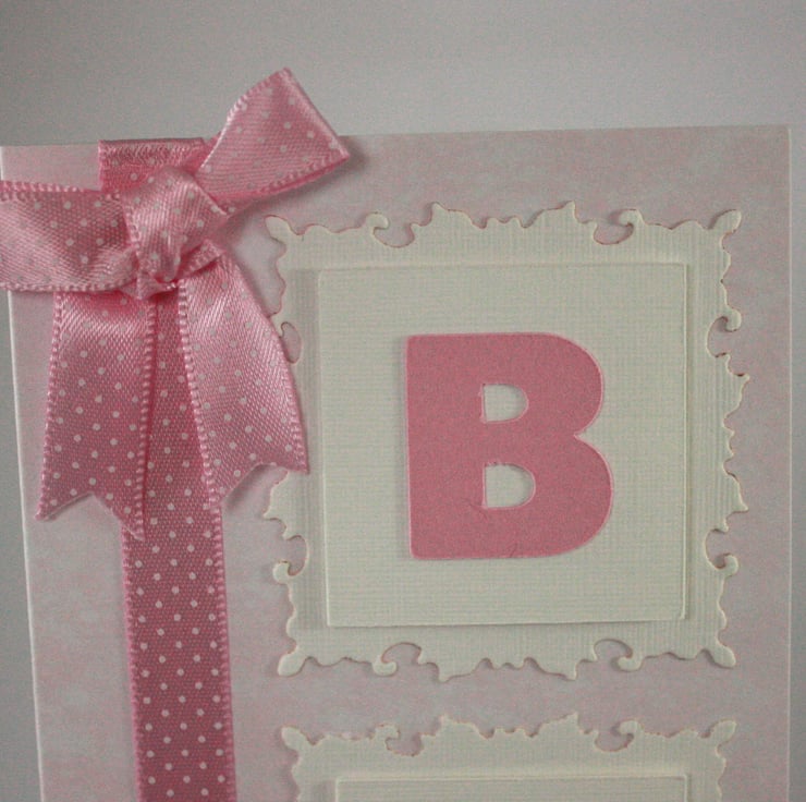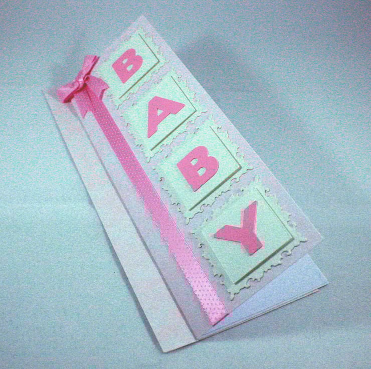 Tall, pink new baby card. Pink letters spell out the word 'BABY' and are layered onto squares of white linen effect card. A pink polka dot satin ribbon and bow finish the card.