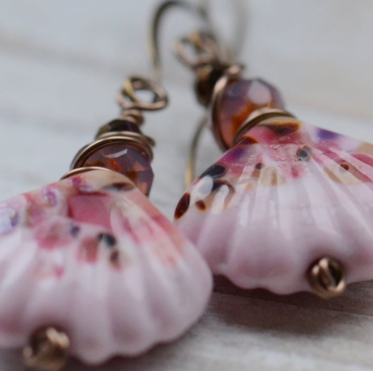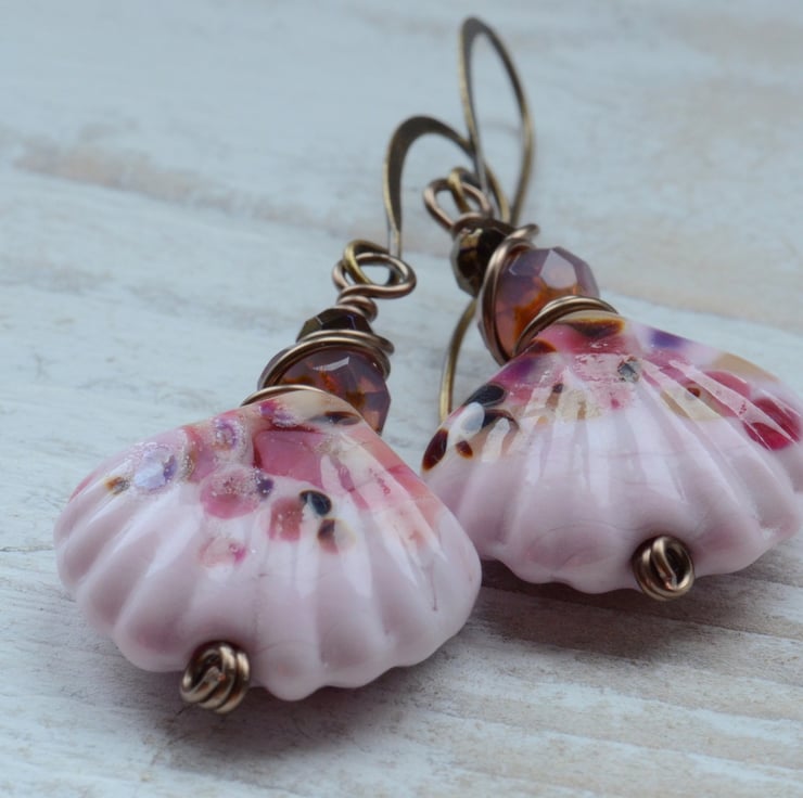 Beautiful lampwork glass pink shell beads are the focal for these earrings which I have teamed with wire wrapped pink faceted and gunmetal Czech rondelle beads and finished on artisan style antique bronze earwires.