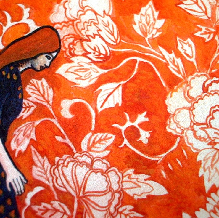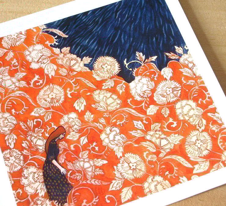 I had two quite different inspirations for this painting, one is German woodcuts, the other is hand-painted Indian fabric. I tried (and hopefully succeeded!) to merge the two inspirations into an intricate, decorative and timeless image.