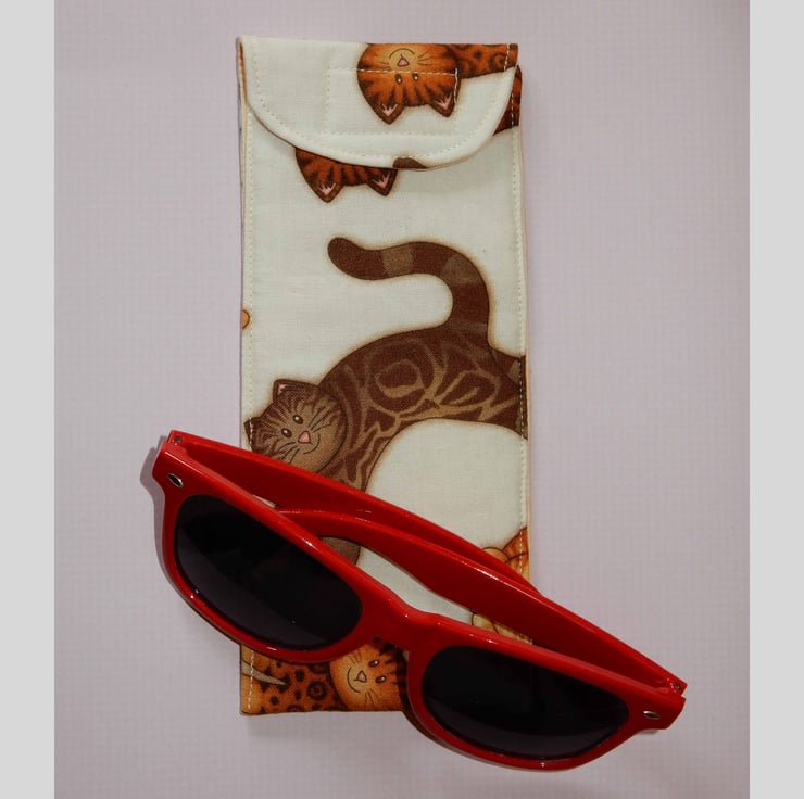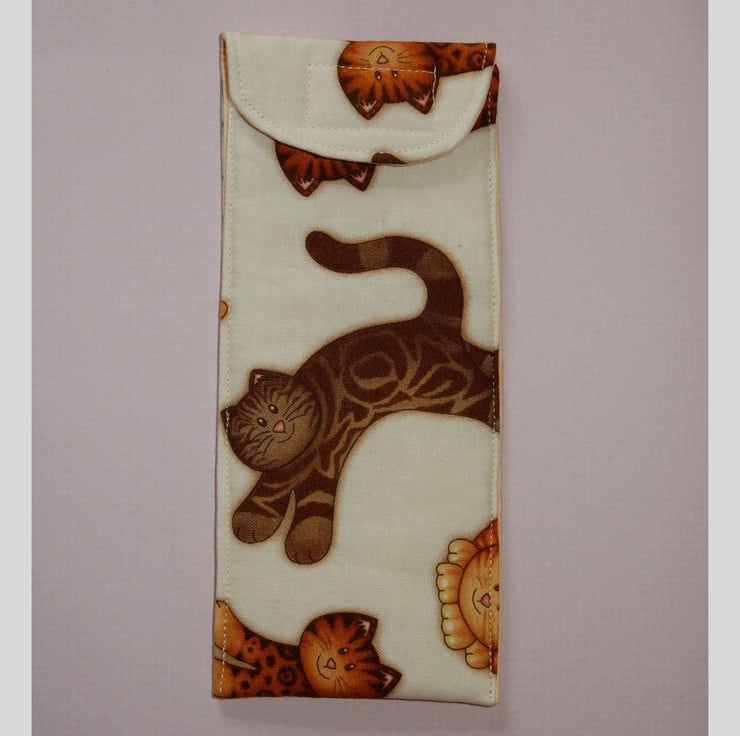 A handy case for your glasses or sunglasses.This is made from a cotton print fabric featuring fun cats, with a toning lining. It also has a layer of wadding for protection. The case fastens with velcro.
