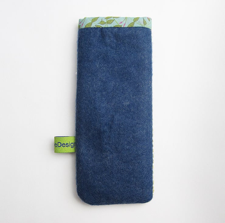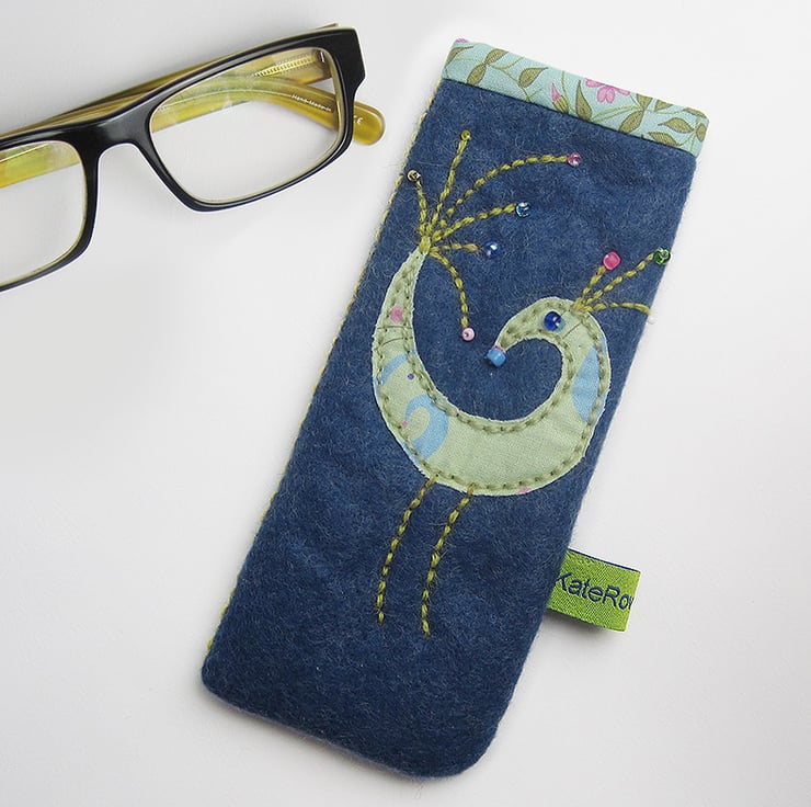 I have made the glasses case from denim blue wool felt and hand appliquéd a pistachio peacock with beaded details onto it. It is lined in an up cycled silk scarf and trimmed with my own Campion cotton print. The glasses case is wadded to protect your glasses. The item measures 17.5cms(7 inches) by 7.5cms(3 inches).