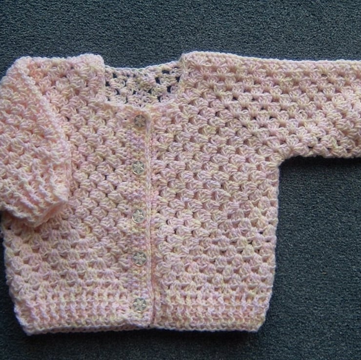 This pretty lightweight crocheted cardigan has been created using a random mix pink/cream 4 ply acrylic yarn.