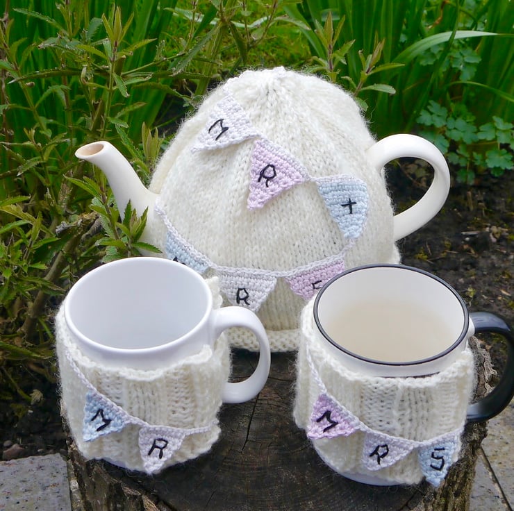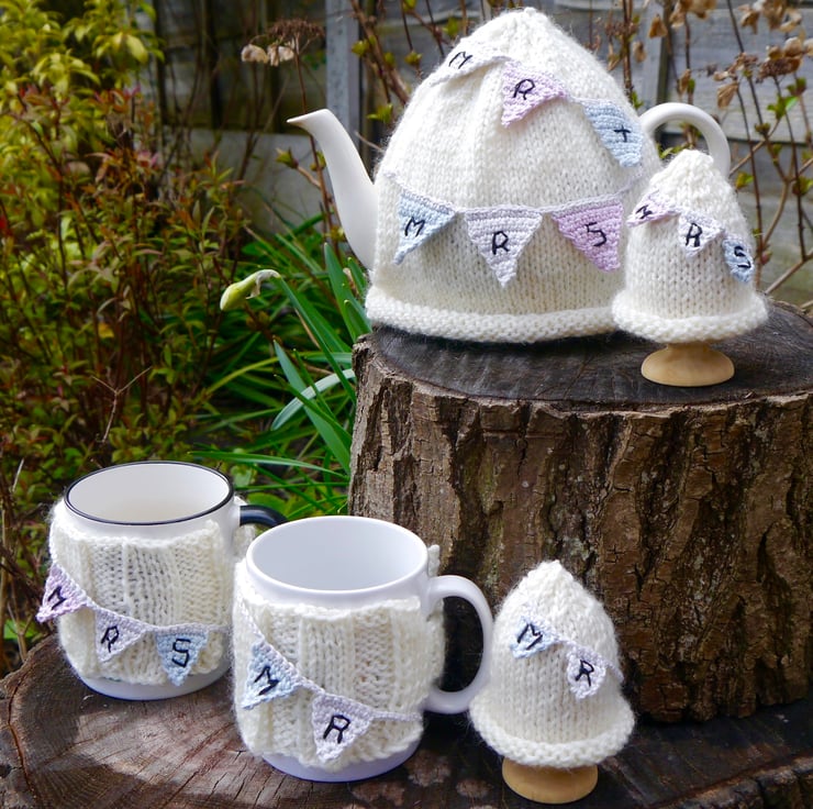 I have embroidered the letters "Mr & Mrs" in black thread on the bunting. There is also a matching pair of egg cosies and a tea cosy in my shop. Please see photos.