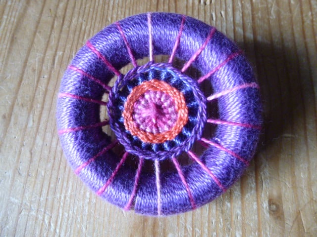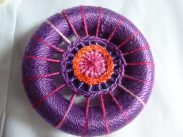 This unique hand made brooch is developed from a traditional Dorset Cross Wheel button and worked in cotton thread.