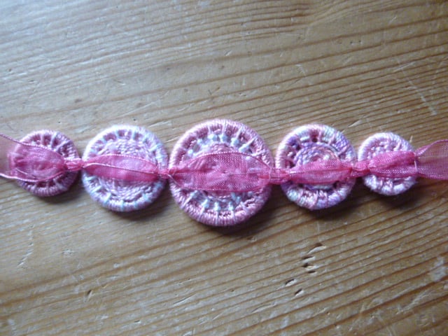 The five buttons are worked on metal rings in three sizes, 32mm, 25mm and 18mm and are securely attached to a 1m long 12mm toning pink organza ribbon which allows flexibility in wear and is easily tied and adjusted. The necklace can be worn high on the neck as a choker or adjusted to sit lower to suit the neckline of the garment being worn.