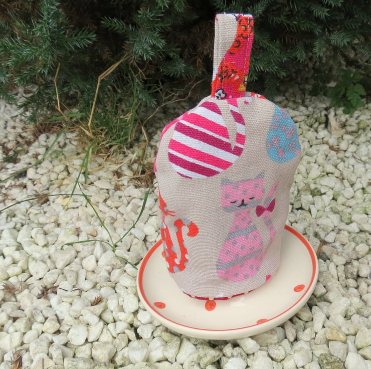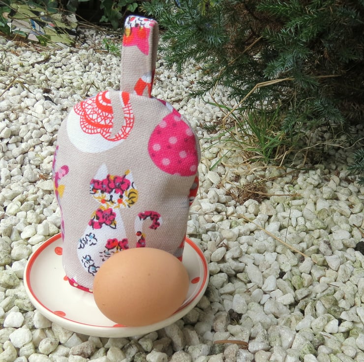 The lining fabric is a polka dot cotton, with an additional layer of wadding to keep your egg piping hot.