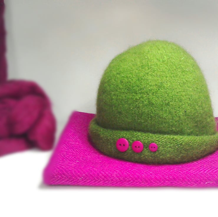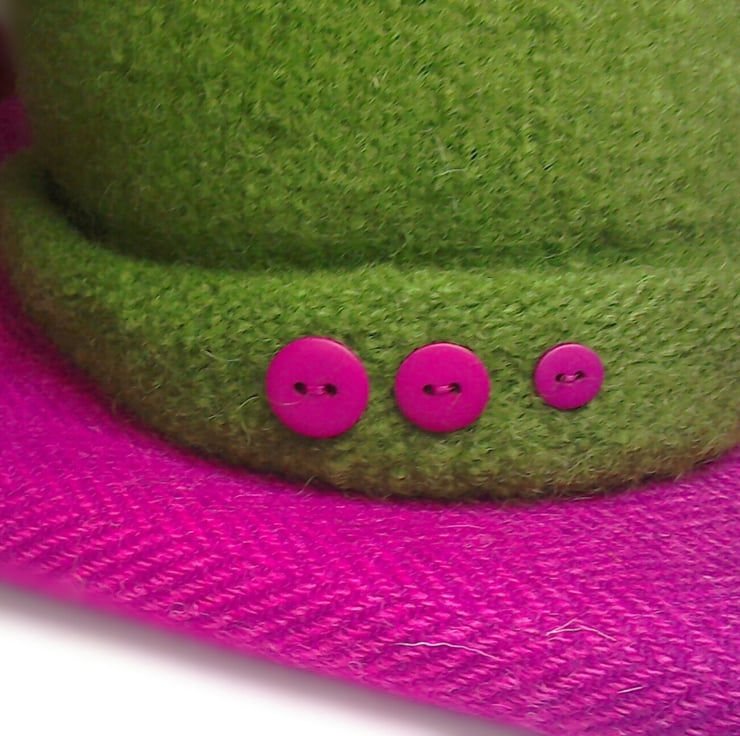 This vintage style felted wool cloche hat with pink button trim is made from 100% wool with three buttons in a gorgeous shade of pink.