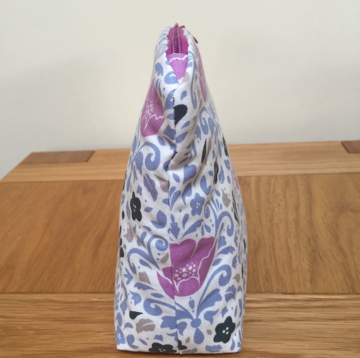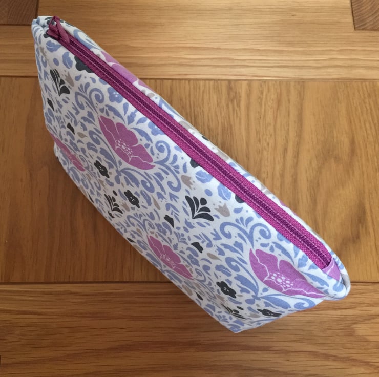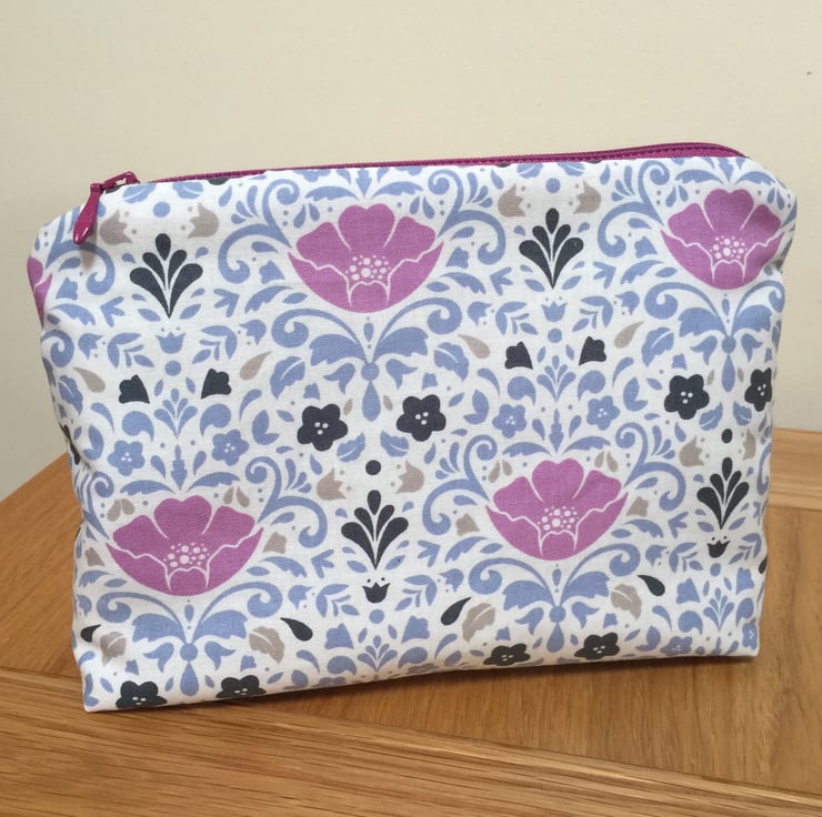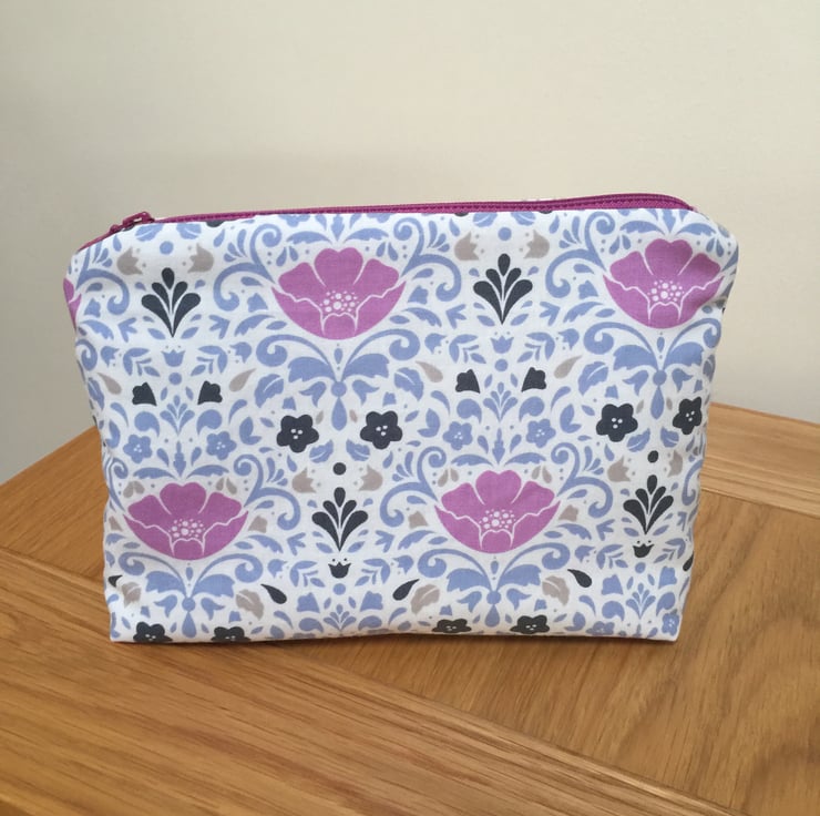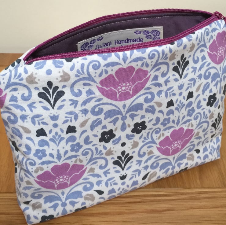 This large cosmetic bag is made from a stunning floral damask print cotton and lined with a contrasting cotton fabric.Both the bag and lining have had batting and interfacing added to give a lovely soft feel and structure.The corners have been boxed to provide stability . The bag has a matching orchid coloured zip closure. A perfect accessory to keep your make up and toiletries together and tidy.
